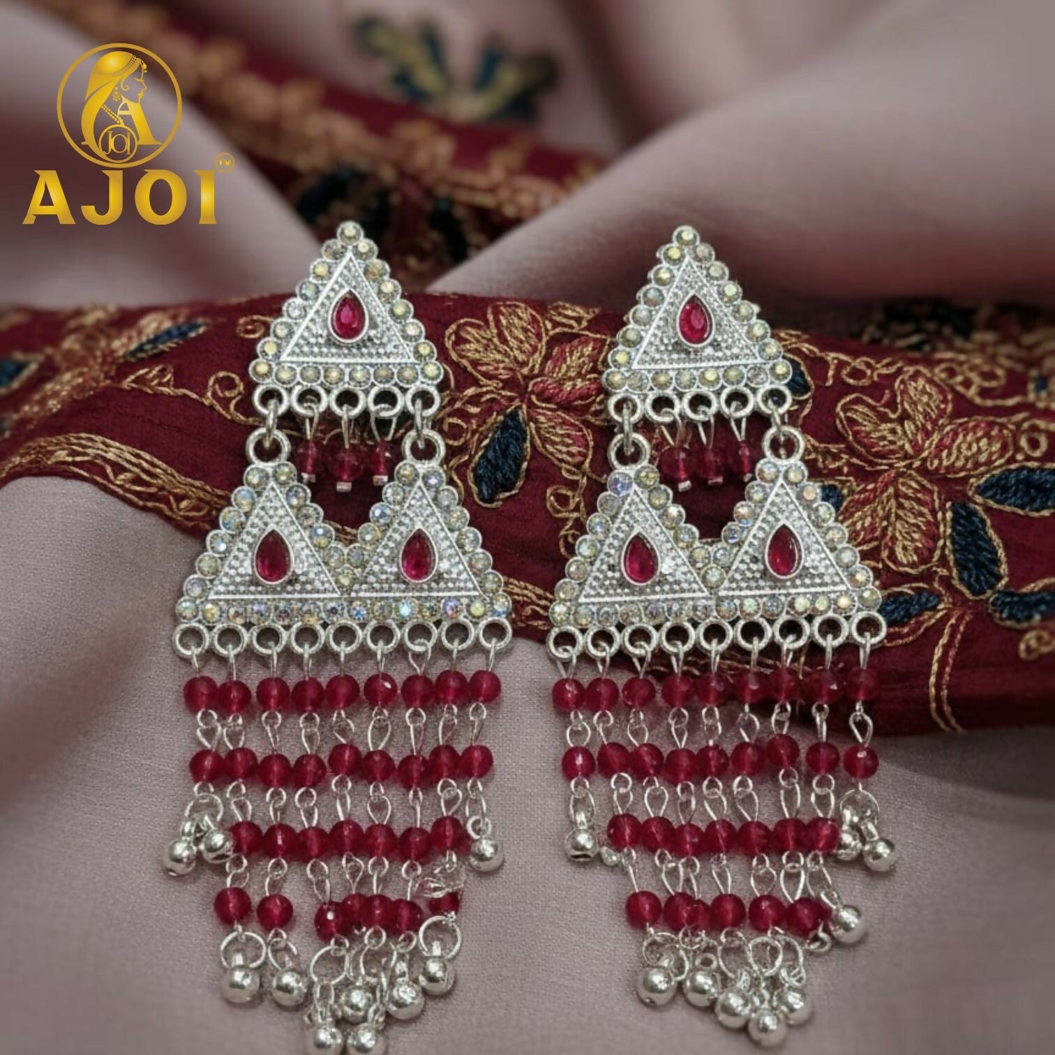 Elevate your ethnic style with these premium silver-tone triangle earrings, beautifully adorned with ruby red stones and delicate hanging beads. A perfect blend of tradition and elegance for festive and wedding wear.