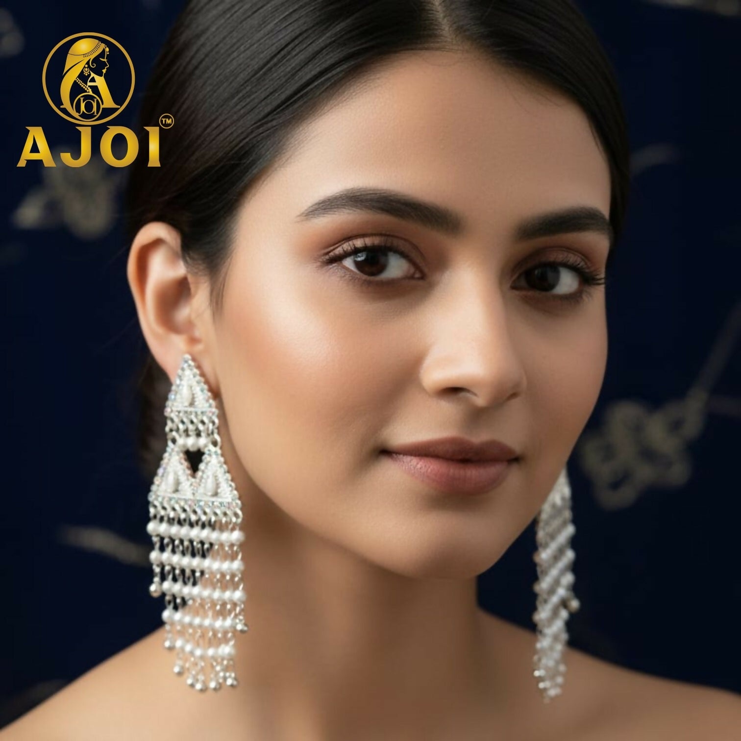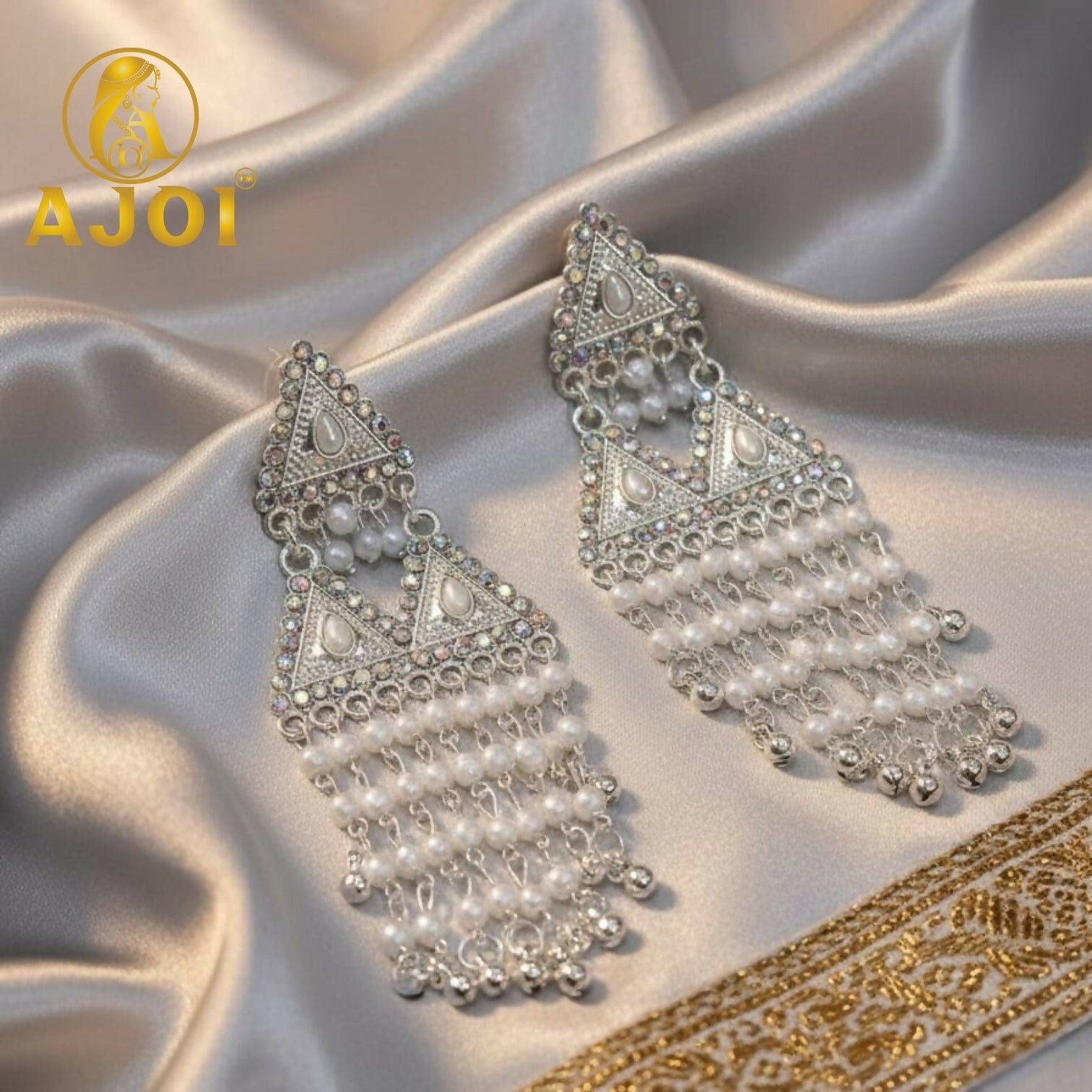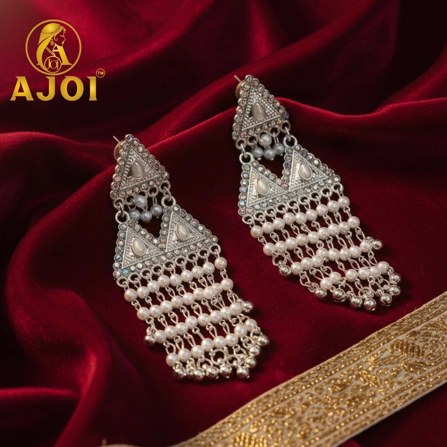 Enhance your festive elegance with these premium silver-tone triangle earrings, beautifully detailed with pearl drops and intricate craftsmanship. A graceful statement piece perfect for weddings, parties, and traditional occasions.