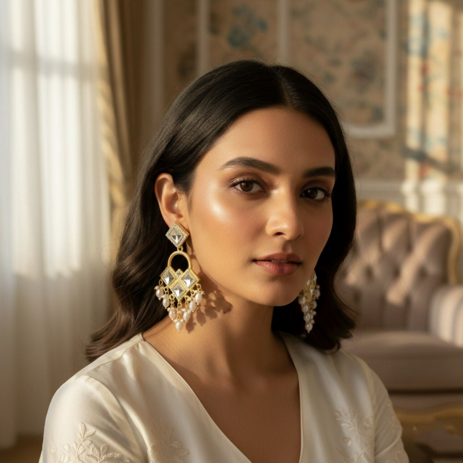 These elegant earrings combine geometric precision with traditional Indian craftsmanship, making them a standout accessory for formal occasions.