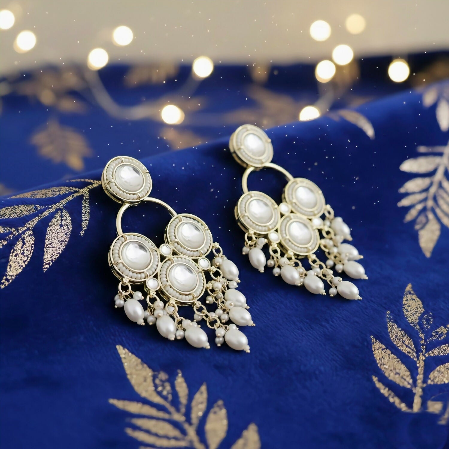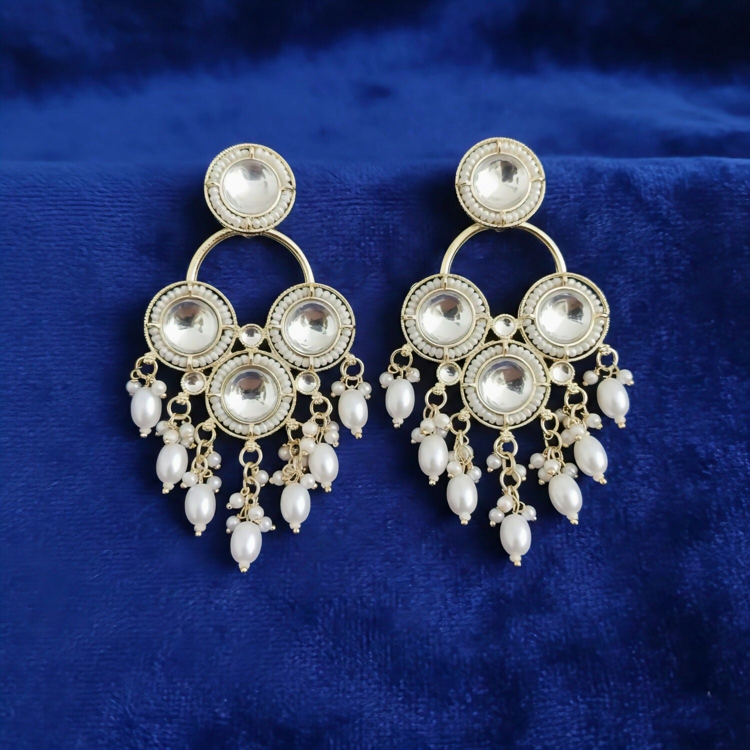 Design Style: Traditional Kundan/Polki-style chandelier earrings.