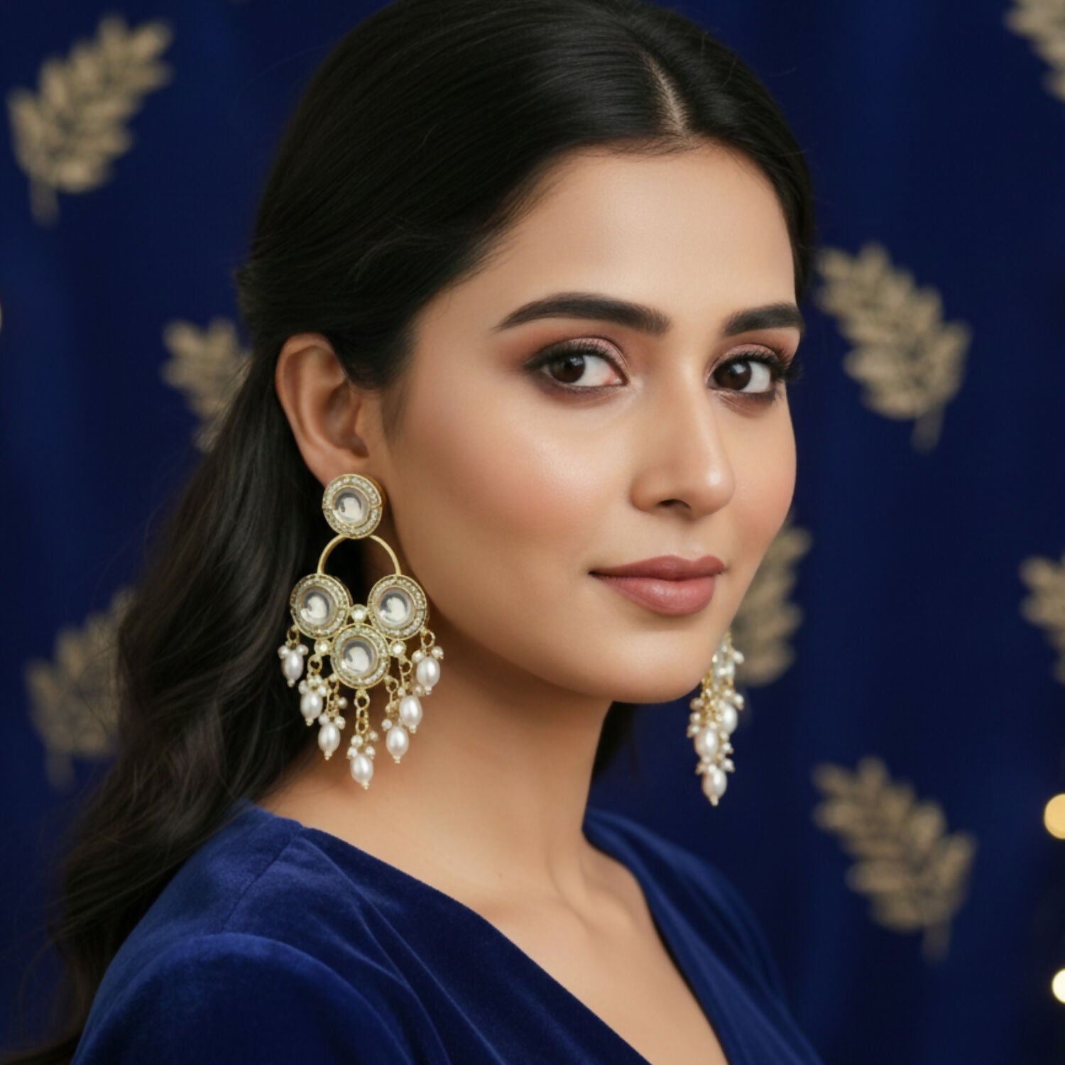 These earrings are a beautiful example of traditional Indian craftsmanship, blending a regal aesthetic with a modern finish. They feature a sophisticated Chandbali-inspired silhouette that is both elegant and festive.