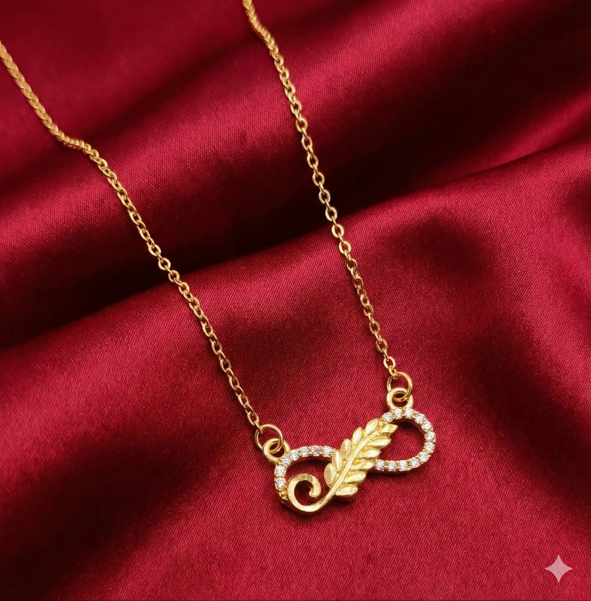 Embrace the beauty of nature and the promise of forever with our stunning Gold Infinity Leaf Necklace. This piece perfectly balances modern elegance with symbolic meaning, making it a must-have addition to your jewelry collection or the perfect gift for someone special.Design & Craftsmanship:At the heart of this necklace is a unique interplay of shapes. The classic infinity symbol ($\infty$), representing eternal connection, is intertwined with a delicately sculpted leaf motif. One loop of the infinity symbol features a high-polish gold finish, while the other is adorned with shimmering [Insert Stone Type: e.g., Cubic Zirconia / Crystal / Diamond] accents, adding just the right amount of sparkle to catch the light.