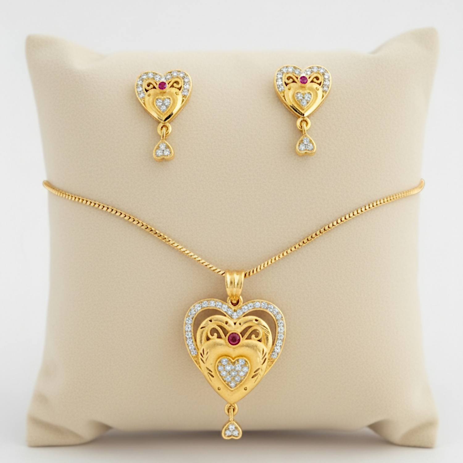 Gold-plated Heart Pendant and Earrings Set with Ruby and Cubic Zirconia
