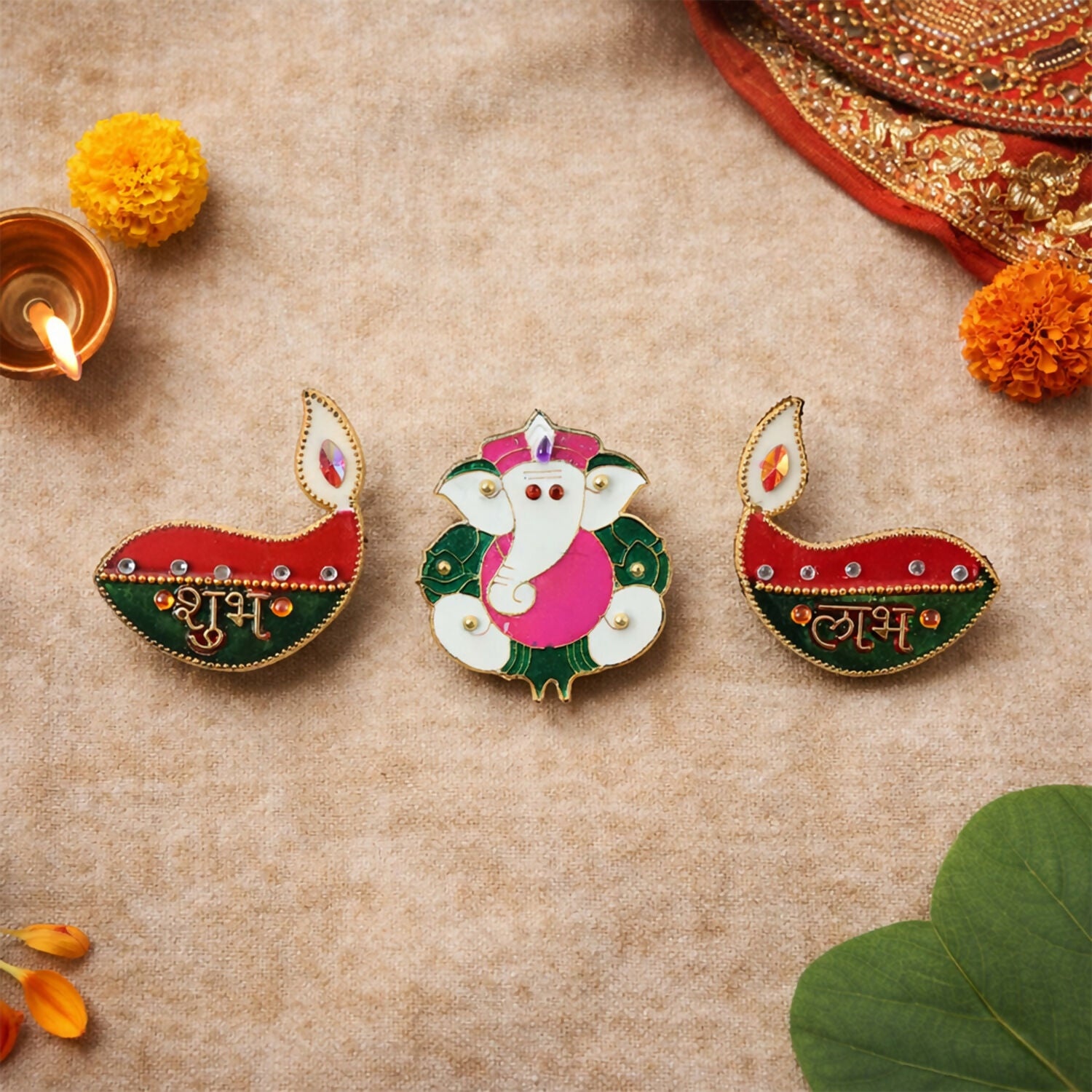• Set of 3 – Ganesh ji in center with Shubh & Labh diya shaped pieces
