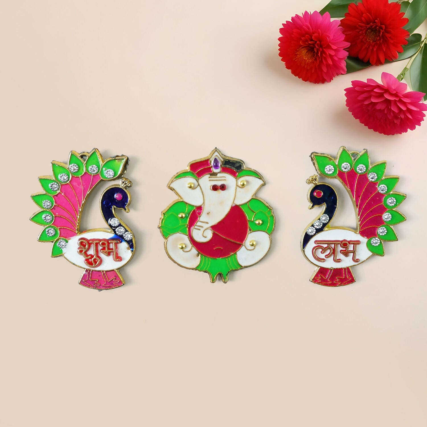 Acrylic Meenakari Peacock Ganesh Shubh Labh Door Hanging – Set of 3