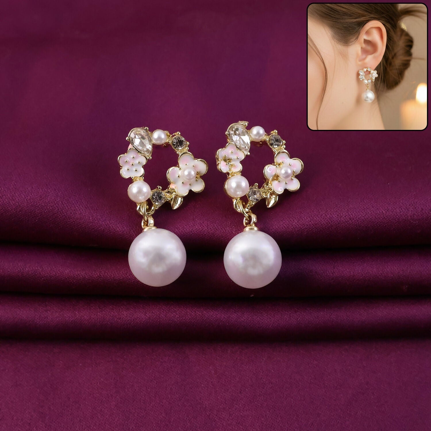 Vintage Rose Pearl Stud Earrings for Women – Elegant Gold Floral Design