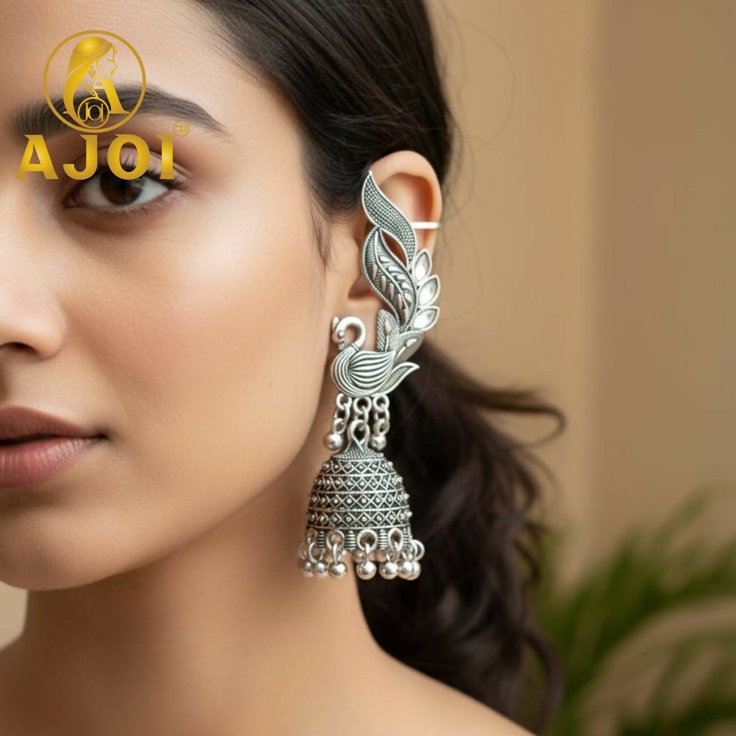 The antique silver finish enhances their regal appeal, while the fine detailing and subtle movement of the dangling elements add a touch of refined charm. Ideal for weddings, festive occasions, and statement styling, these earrings embody luxury, tradition, and artistic excellence—crafted for those who appreciate enduring elegance.