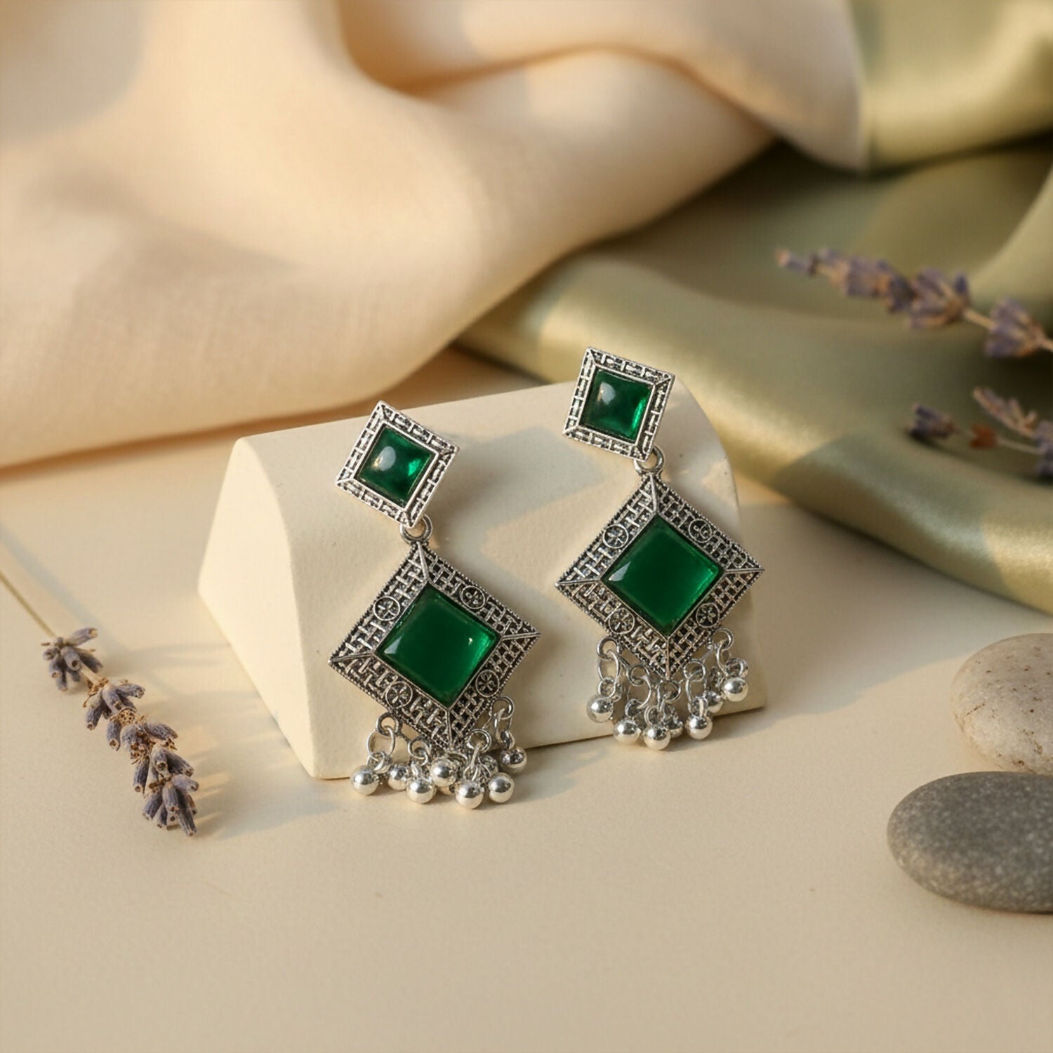 Traditional Indian Oxidised Dangler Earrings with Square Green Monalisa Stones
