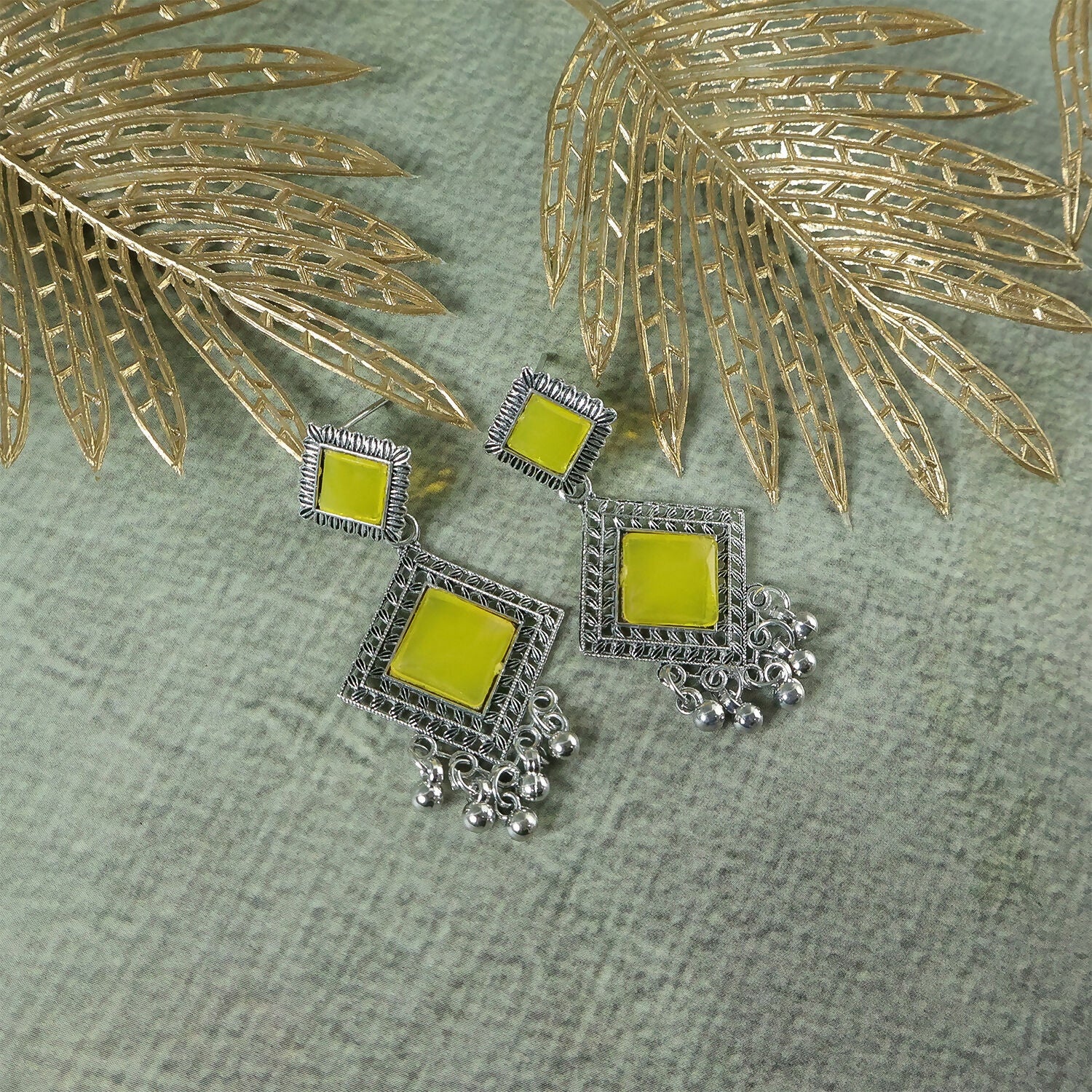Traditional Indian Oxidised Dangler Earrings with Square Yellow Monalisa Stones