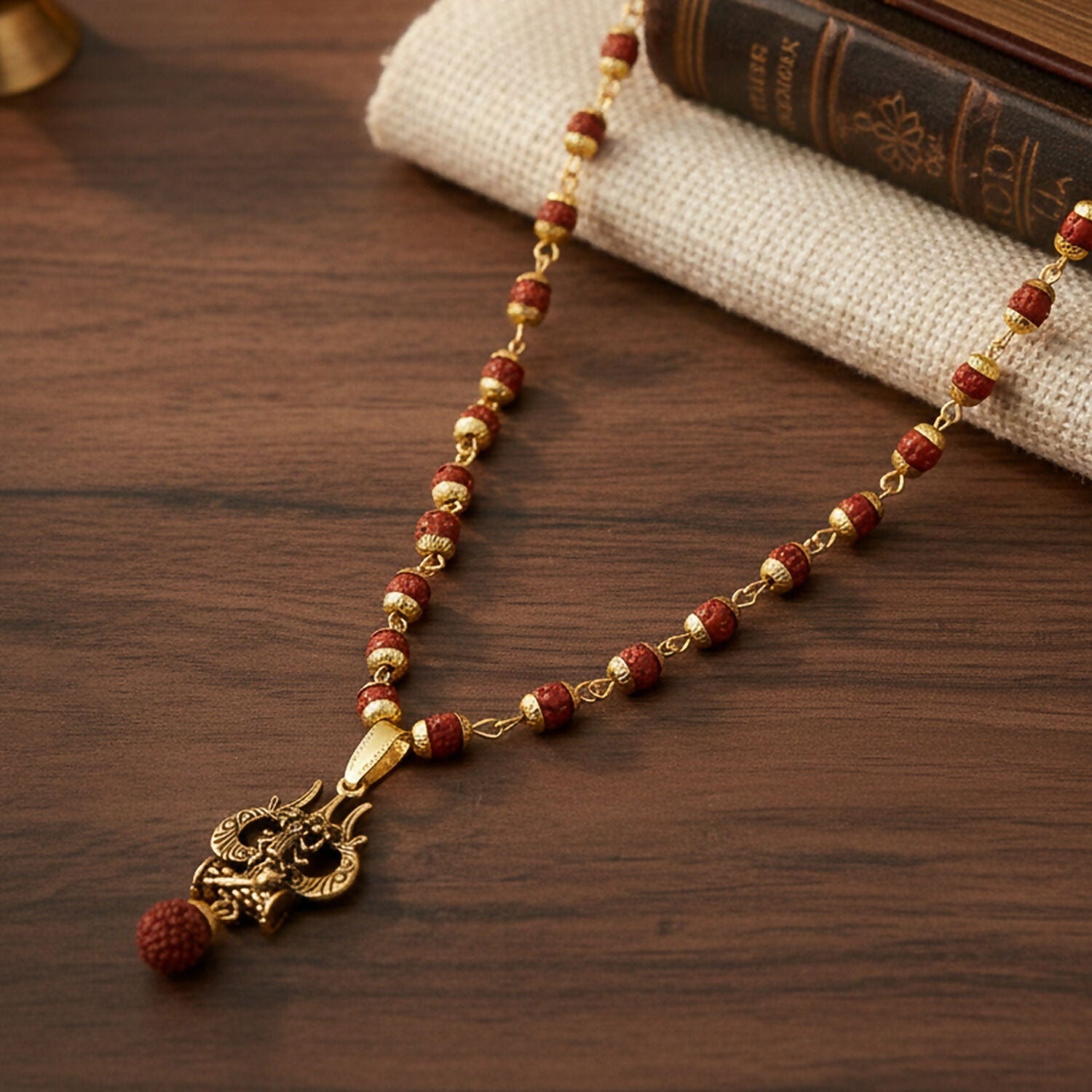 Channel divine strength and tranquility with this masterfully designed Shiva Trishul Pendant paired with a sacred Rudraksha bead mala. This necklace is a perfect blend of traditional spirituality and ornate craftsmanship, making it a meaningful accessory for daily wear or special occasions.Invoke the strength and devotion of the Monkey God with this intricately designed Lord Hanuman Pendant paired with a traditional Rudraksha bead mala. This spiritual accessory is crafted to symbolize courage, protection, and unwavering faith.Iconic Imagery: The pendant features a detailed depiction of Lord Hanuman holding his mighty Gada (mace), representing physical strength and spiritual power.Sacred Rudraksha Chain: The necklace is strung with Rudraksha beads held in gold-toned floral caps, known for their ability to provide peace and mental clarity.Antique Gold Finish: Crafted with a premium antique gold-toned finish that highlights the fine textures of the deity's form and the surrounding ornate patterns.Symbol of Protection: Ideally suited for daily wear or religious gatherings, serving as a constant reminder of Hanuman’s protection and loyalty.
