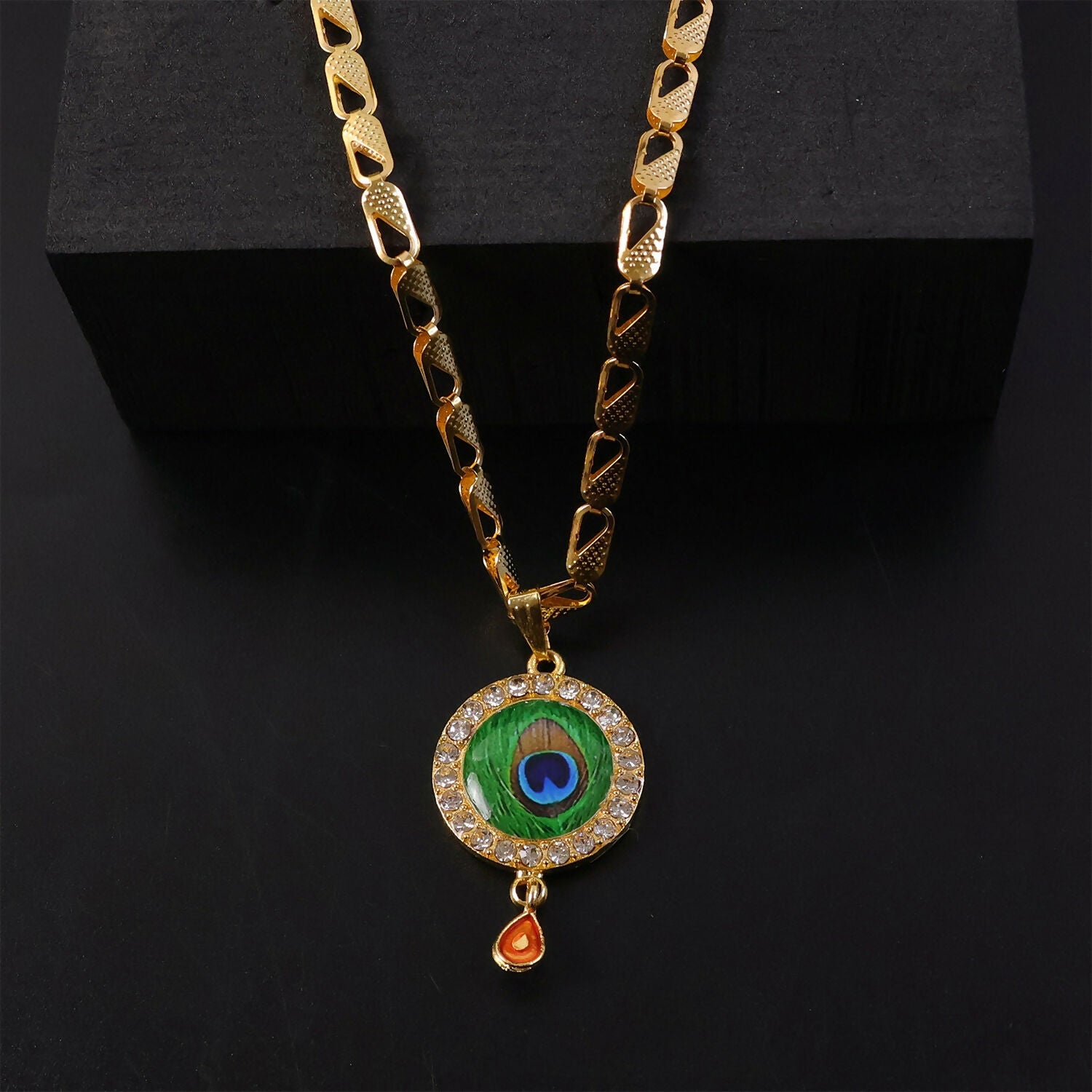 An elegant gold-toned chain necklace featuring a vibrant peacock feather–inspired stone pendant, encircled with sparkling crystal accents. Finished with a delicate drop charm, this piece adds a graceful blend of tradition and modern style—perfect for festive wear, special occasions, or thoughtful gifting.