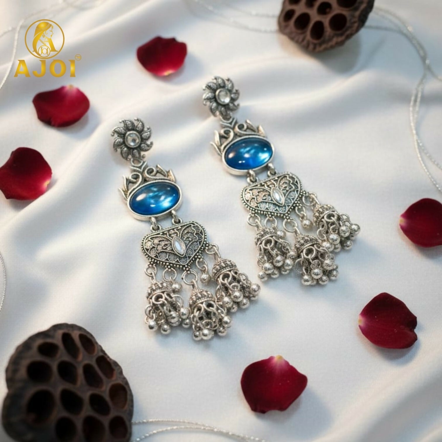 Bring timeless elegance to your ethnic jewelry collection with  Oxidized Silver Turquoise Jhumka Earrings, a perfect blend of traditional artistry and contemporary charm. These beautifully handcrafted earrings feature an intricate floral stud at the top, followed by a striking turquoise-colored stone centerpiece that adds a vibrant pop of color.