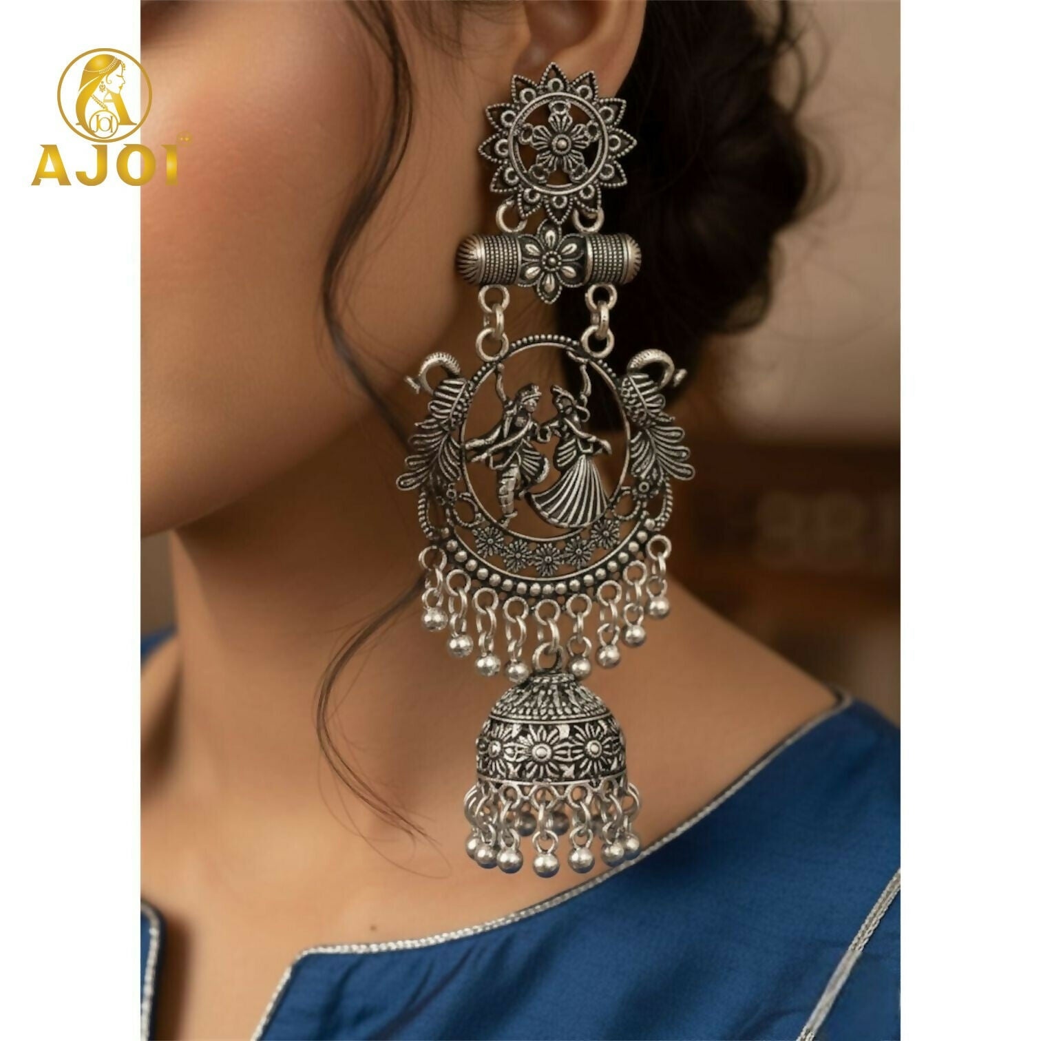 These exquisite earrings are a celebration of devotion, art, and heritage. Crafted in high-quality oxidised silver, the centerpiece beautifully features Radha Krishna engraved within a circular frame, symbolizing eternal love and divine grace. The intricate detailing reflects fine temple craftsmanship, enhanced with traditional patterns and ornate carvings.