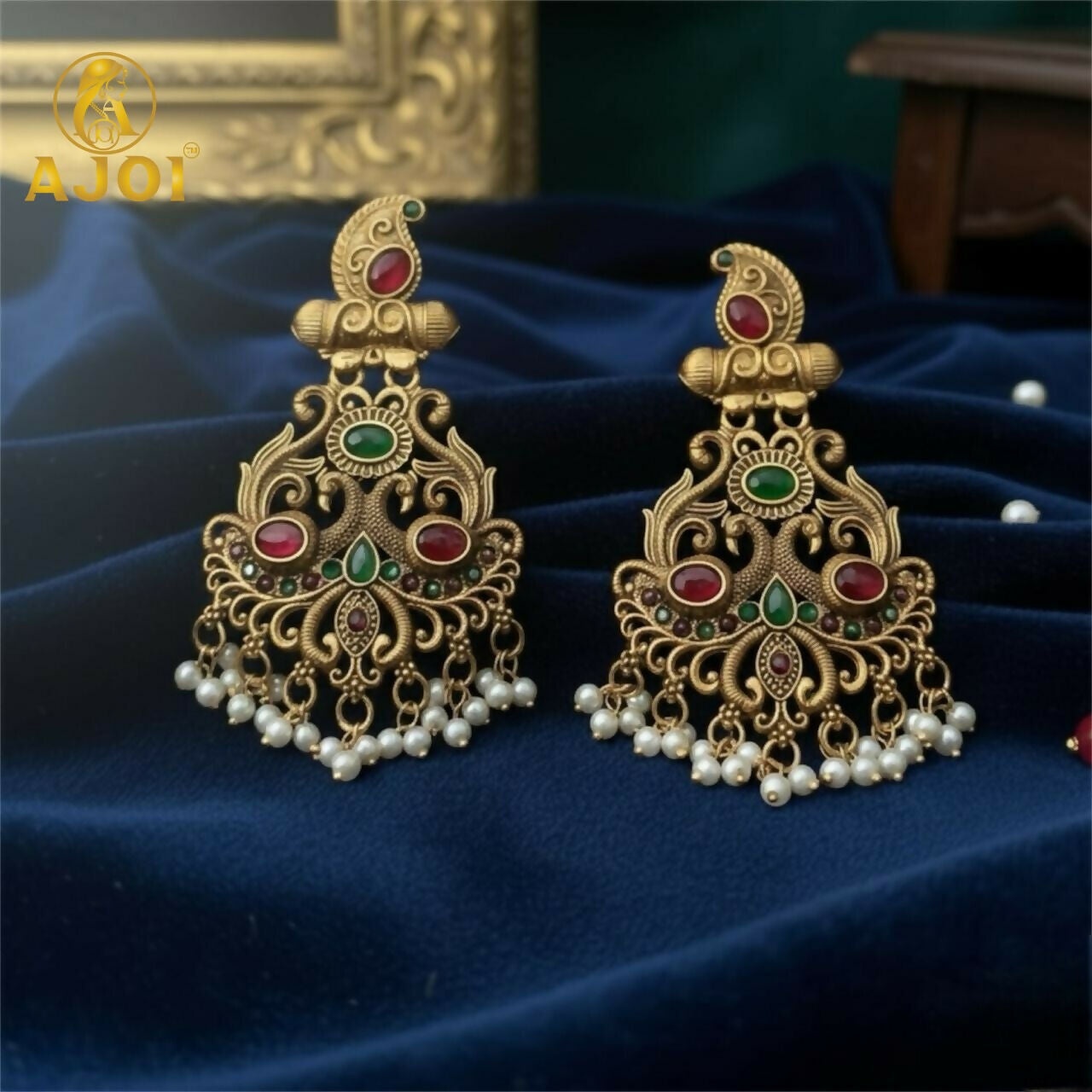 These exquisite earrings embody the richness of traditional temple jewelry, crafted in a beautiful matte antique gold finish that reflects heritage and grandeur. The design showcases intricate curves and motifs adorned with deep red and green stones, symbolizing prosperity and elegance. Every detail speaks of fine craftsmanship—especially the lower section embellished with delicate white pearl droplets that create a graceful sway with every movement.