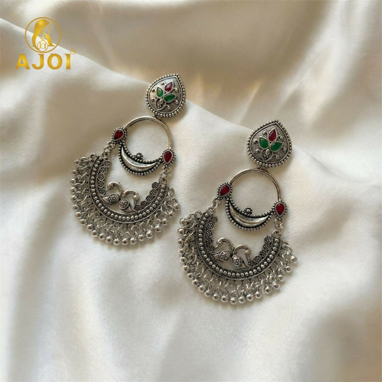 The stud top is beautifully embellished with green and maroon enamel floral motifs, giving a classic Indian heritage appeal. Dangling silver beads along the lower curve create a rhythmic pattern, making the earrings eye-catching and ideal for festive occasions, weddings, or cultural celebrations.