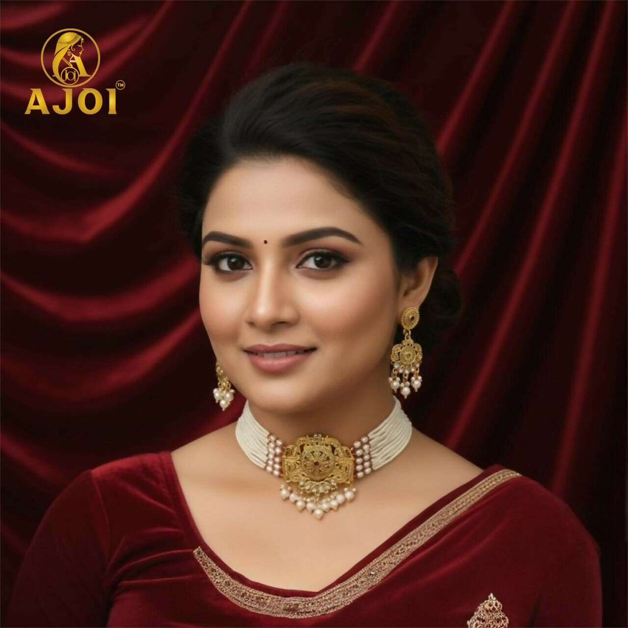 This elegant choker-style necklace features a stunning combination of premium white pearls and antique gold detailing, crafted to bring a perfect balance of tradition and luxury. The centerpiece is intricately designed with a rich temple-inspired motif, showcasing fine filigree artistry that adds royal charm to the entire piece.