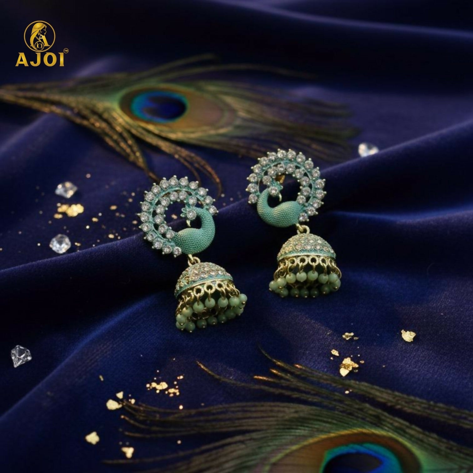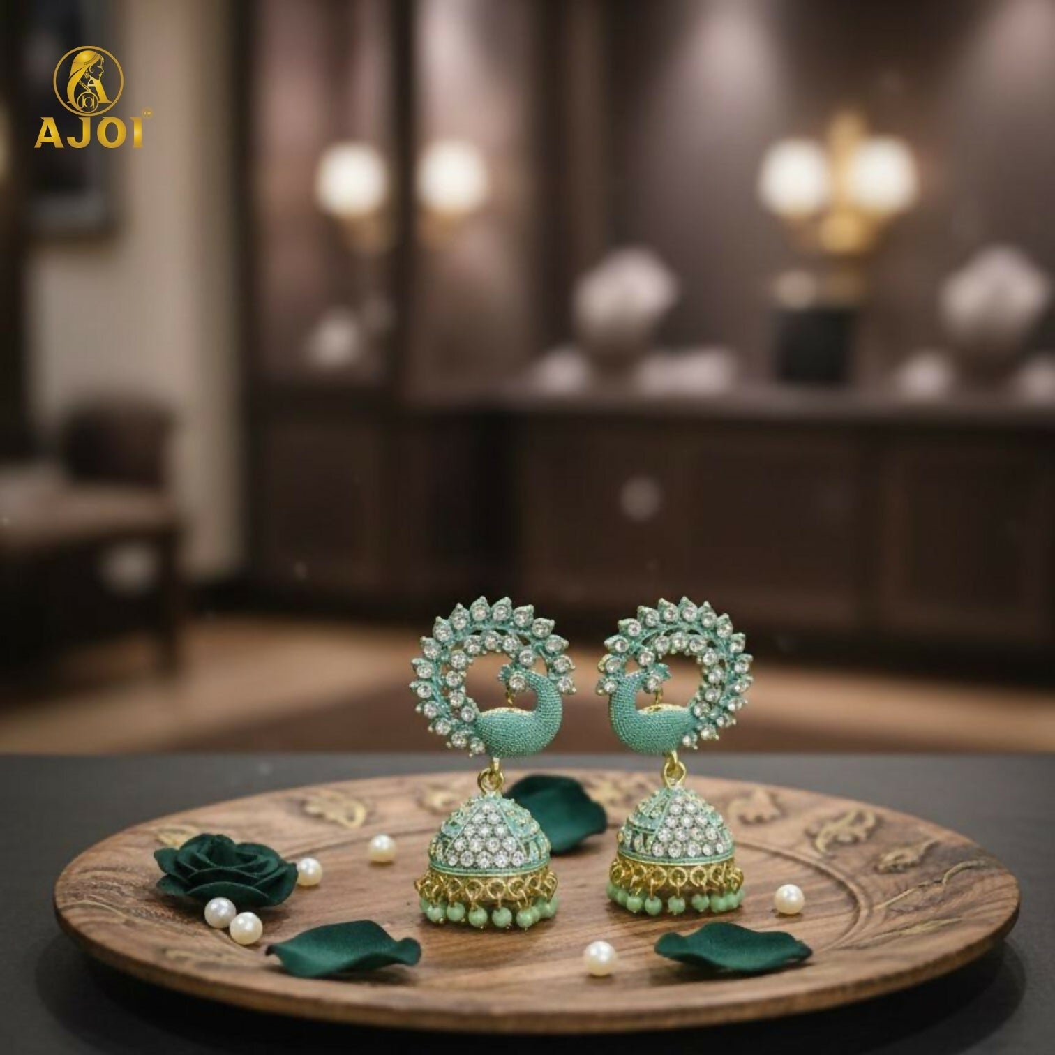 These elegant Mint Green Peacock Stone Jhumka Earrings are a beautiful fusion of traditional charm and modern aesthetics. The upper stud features a graceful peacock-inspired design, highlighted with shimmering clear stones arranged in a circular feather pattern that catches the light beautifully. The mint green textured finish adds a fresh and luxurious touch.