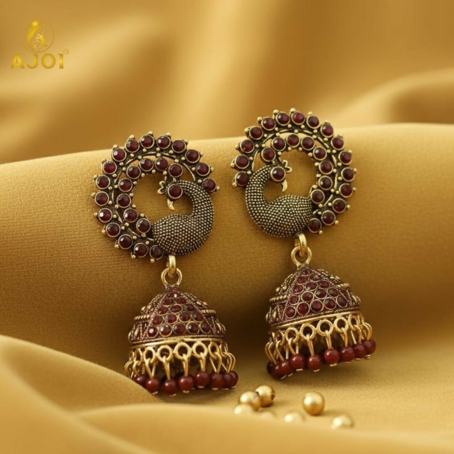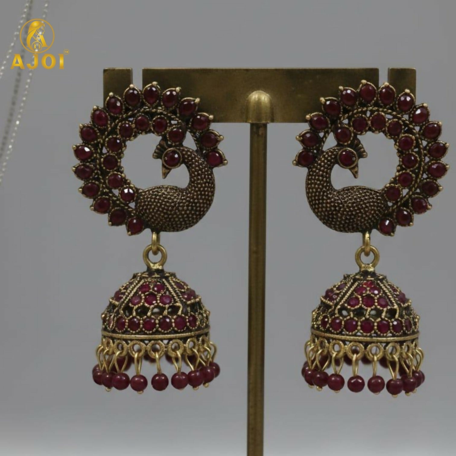 Royal Maroon Peacock Jhumka Earrings – Antique Gold Finish