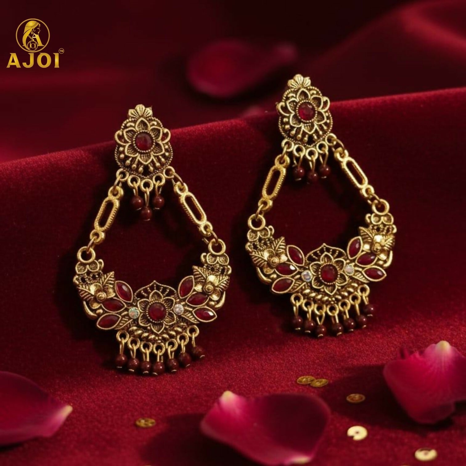 Enhance your ethnic look with these stunning Vintage Maroon Floral Chandbali Earrings, designed with traditional artistry and antique royal charm. The chandelier-style silhouette features intricate floral motifs highlighted with rich maroon enamel accents, giving the earrings a regal and elegant appeal.