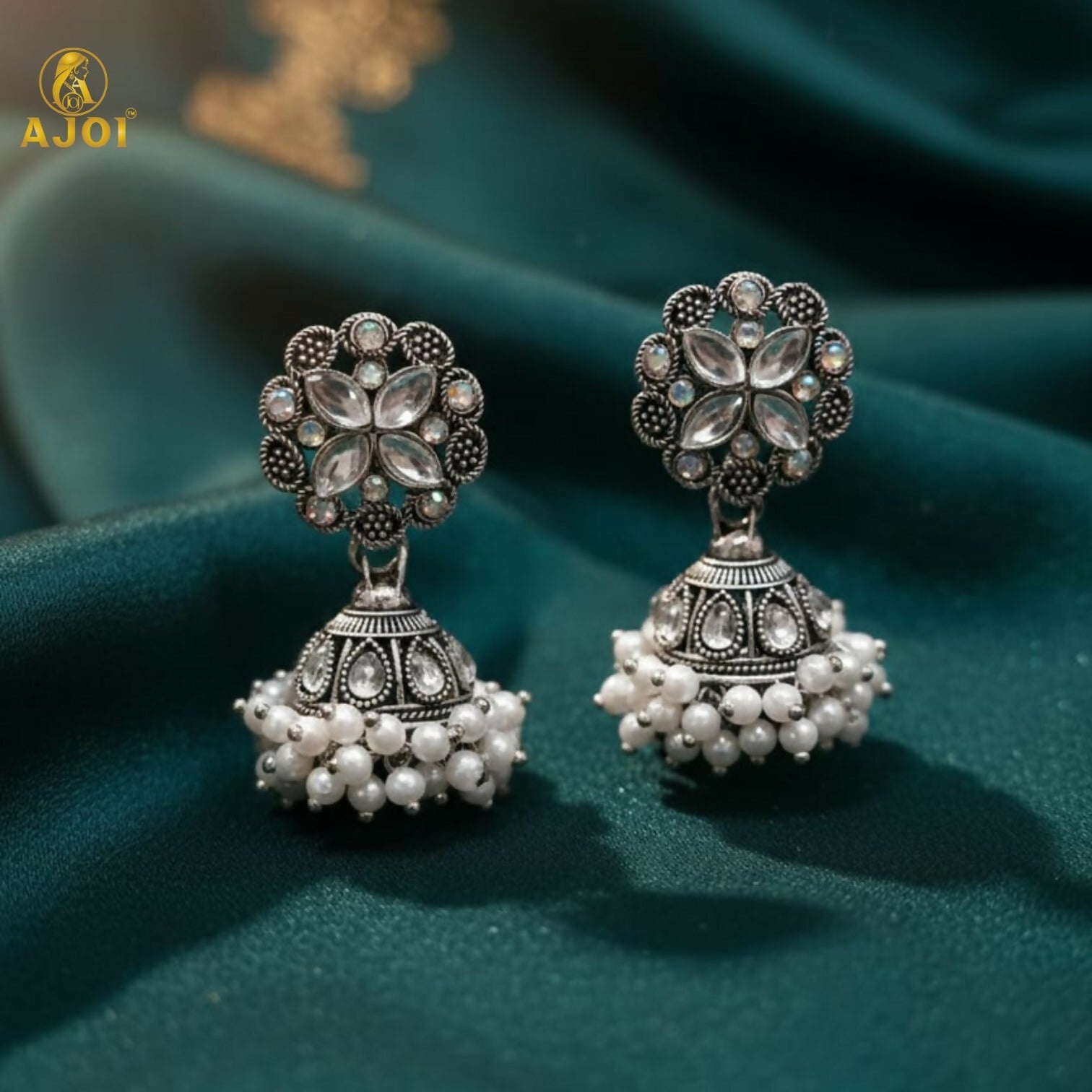 Enhance your traditional look with these exquisite oxidized silver jhumka earrings, beautifully crafted with a floral motif studded with shimmering stones. The intricate detailing is complemented by graceful clusters of pearl drops, adding timeless elegance and charm. Perfect for festive occasions, weddings, or ethnic wear, these earrings effortlessly blend classic artistry with contemporary style. Lightweight yet striking, they are designed to make a statement while ensuring comfort all day long.