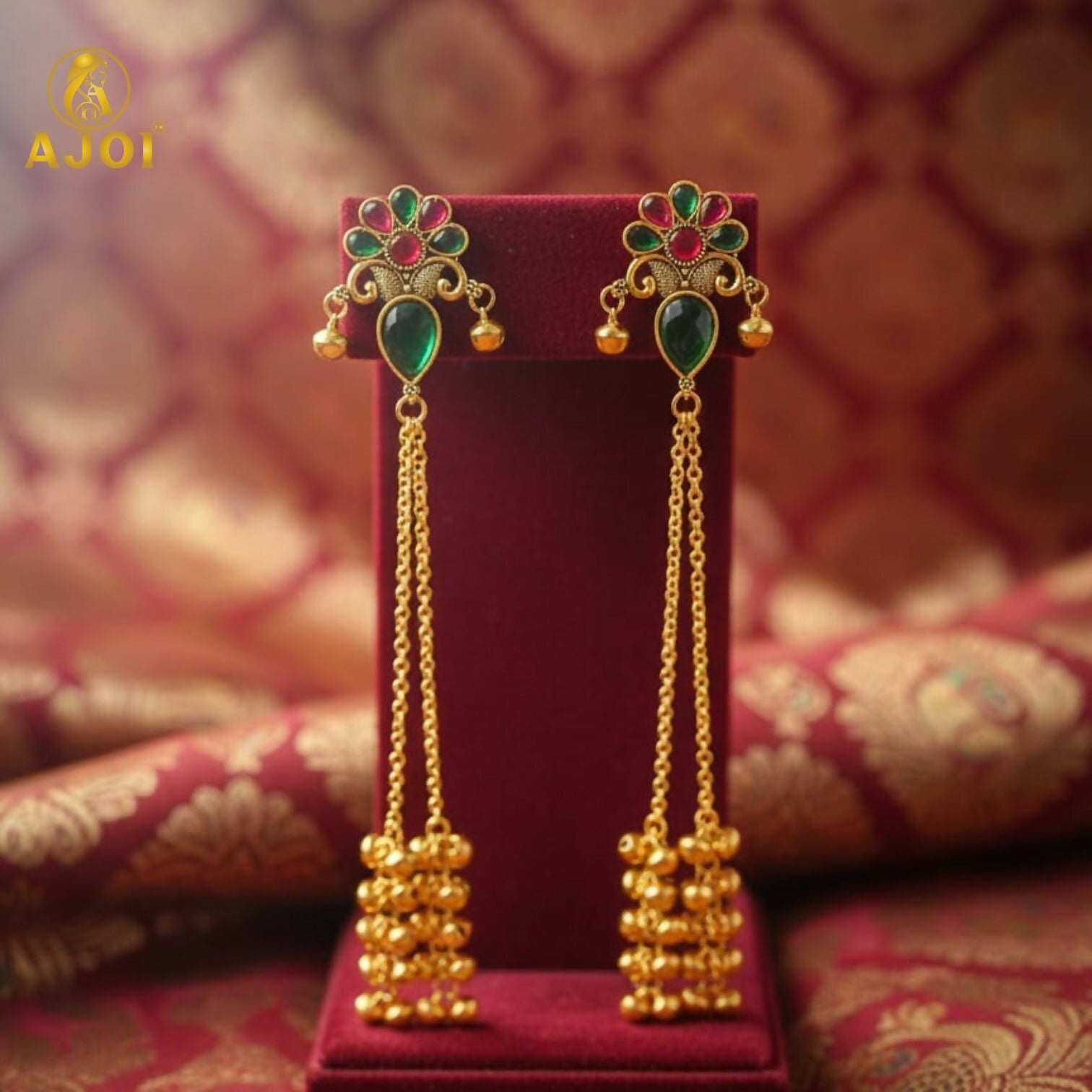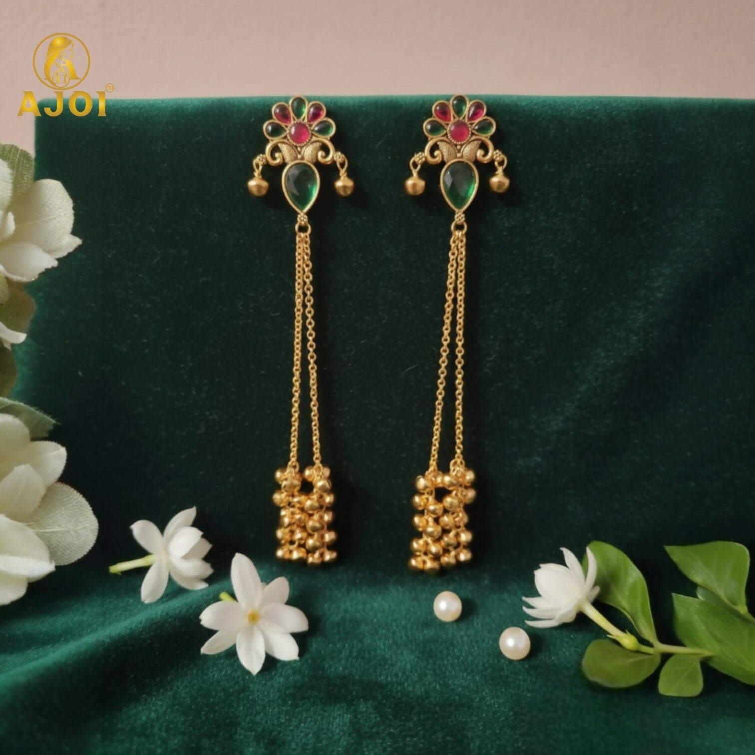 Add timeless elegance to your ethnic wardrobe with these beautifully crafted Kashmiri-inspired long latkan earrings. Designed with a vibrant multicolor floral stud top and an attractive pear-shaped green stone drop, this jewellery piece showcases classic traditional artistry. The graceful dangling gold chains and clustered ghungroo beads create a charming jhumka-style movement effect.