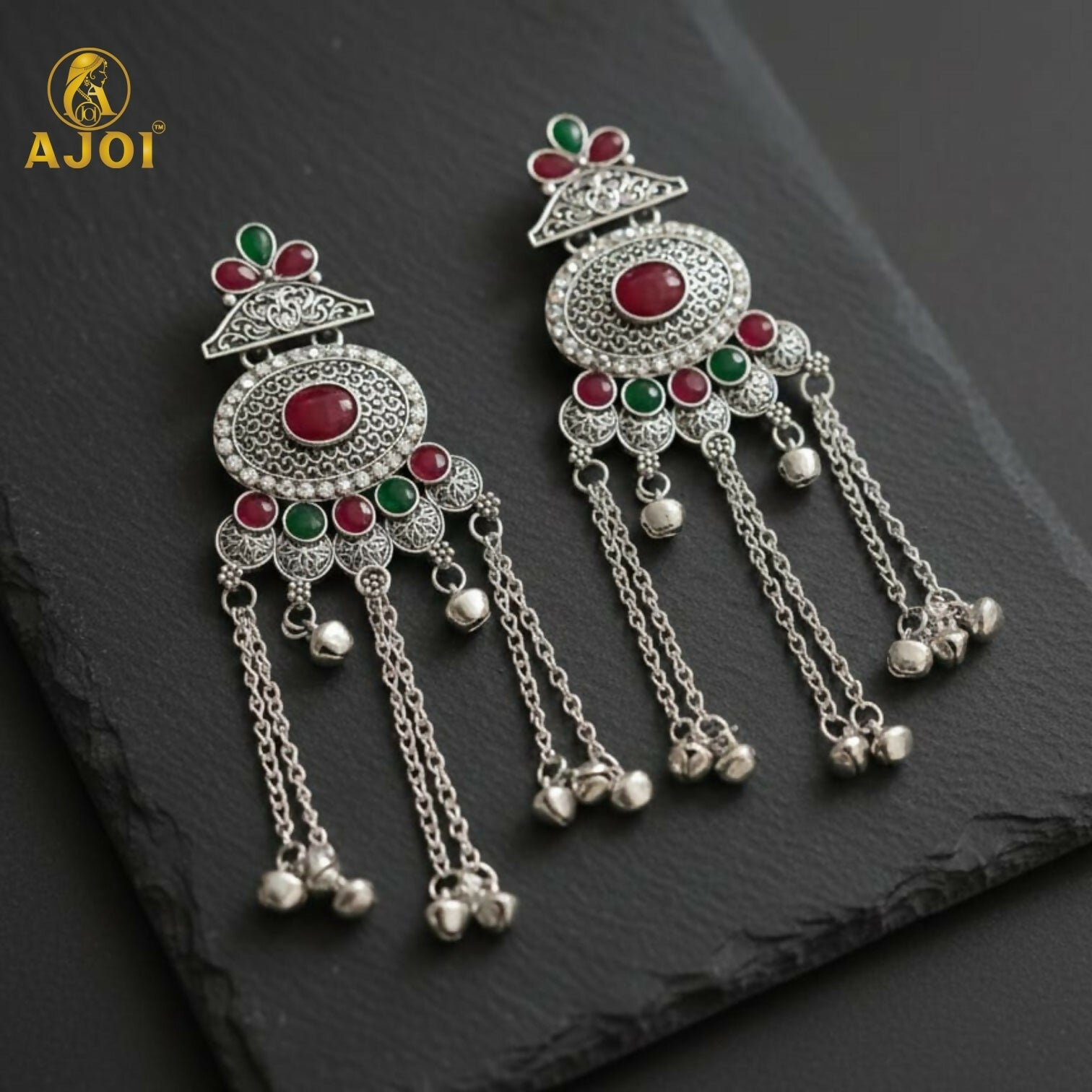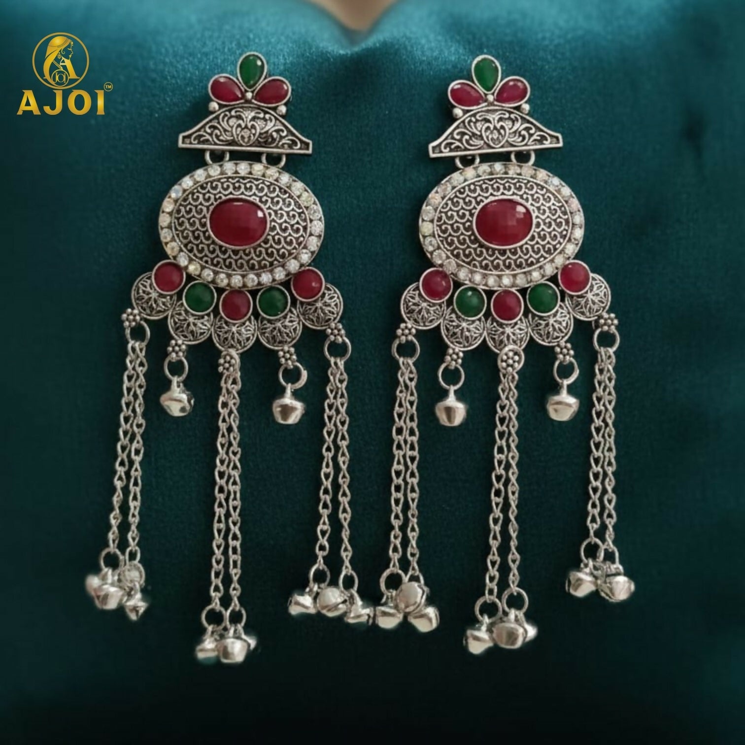 Upgrade your ethnic jewellery collection with these stunning traditional Kashmiri-style oxidised silver earrings. Featuring an intricate oval centerpiece adorned with bold red and green stone accents, this design beautifully blends antique craftsmanship with modern elegance. The earrings are enhanced with multiple dangling chains and delicate ghungroo latkan beads that create an eye-catching statement look.
