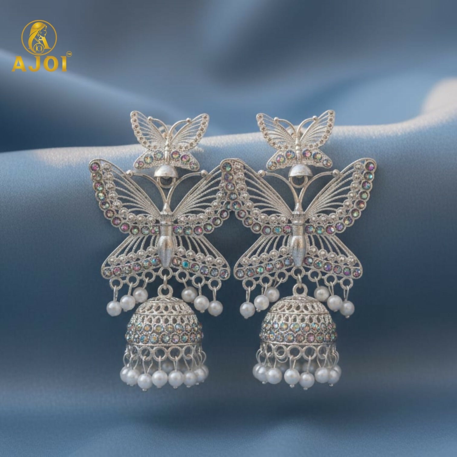 Add a touch of elegance and charm to your ethnic look with these beautifully crafted Butterfly Designer Jhumka Earrings by AJ01. Designed with intricate butterfly motifs, shimmering multicolor stones, and graceful pearl drops, these earrings perfectly blend traditional craftsmanship with modern aesthetics.
