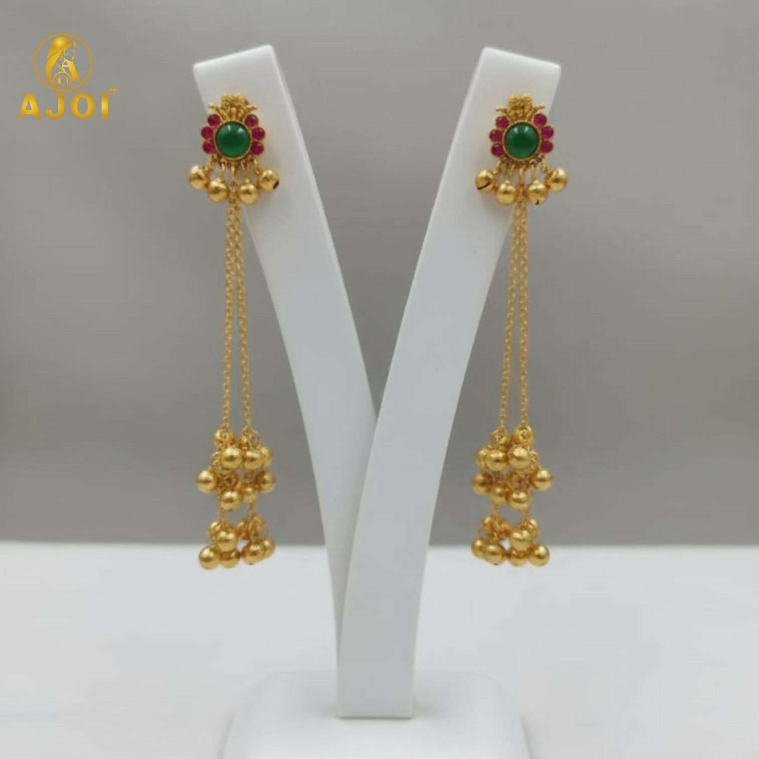 Extending from the stud are elegant dual gold-plated chains that flow effortlessly, leading to lavish clusters of traditional ghungroo bells. These polished ghungroo drops create a soft, rhythmic sway, adding drama and festive charm while maintaining a refined silhouette. The carefully balanced chain length ensures a graceful fall, enhancing both traditional and contemporary looks.
