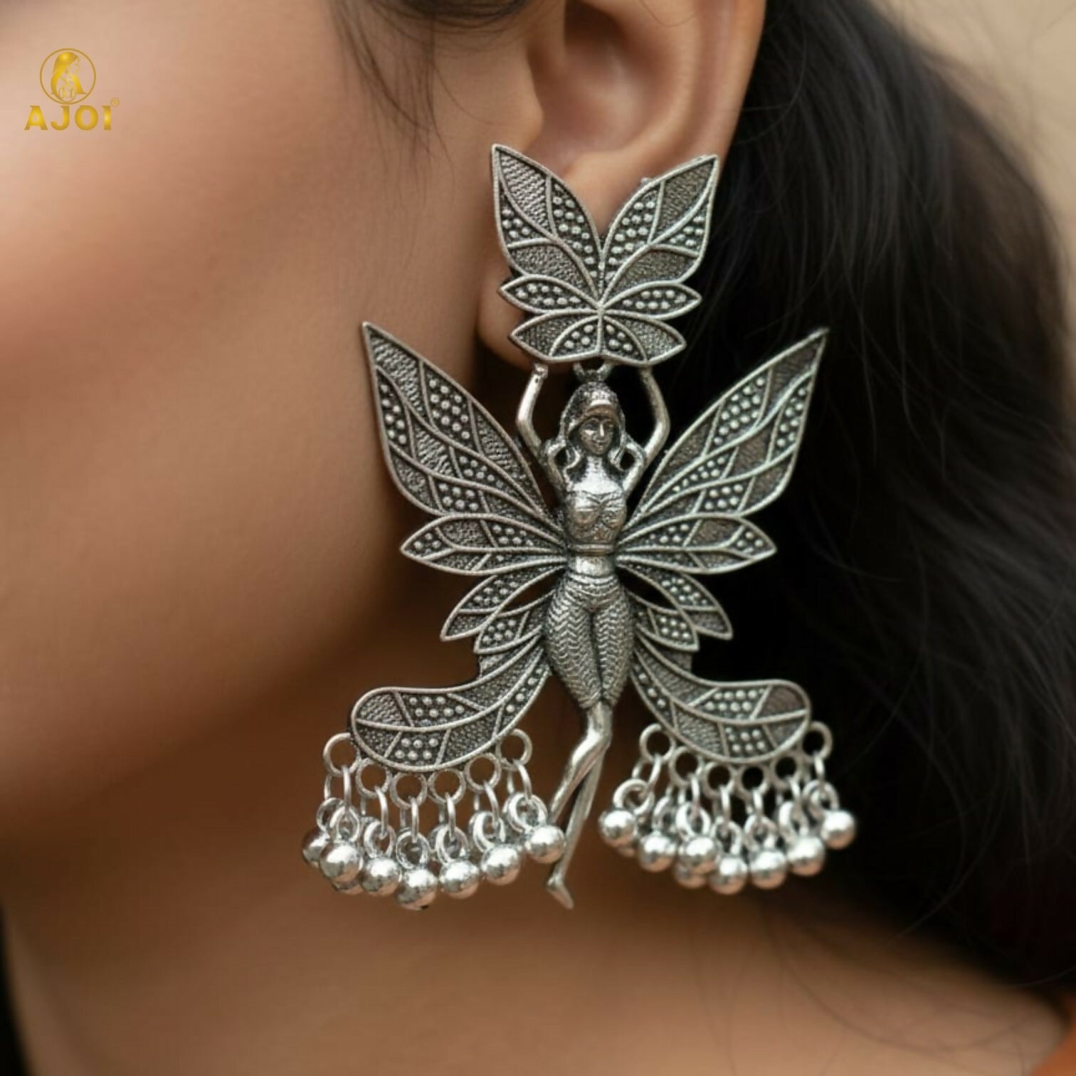 Unveil a touch of magic with these exquisitely handcrafted Enchanted Fairy Wing Statement Earrings, designed for women who love artistic luxury and unique expression. Finished in an elegant oxidized silver tone, these earrings feature a graceful fairy silhouette adorned with intricately detailed wings that symbolize freedom, beauty, and imagination.