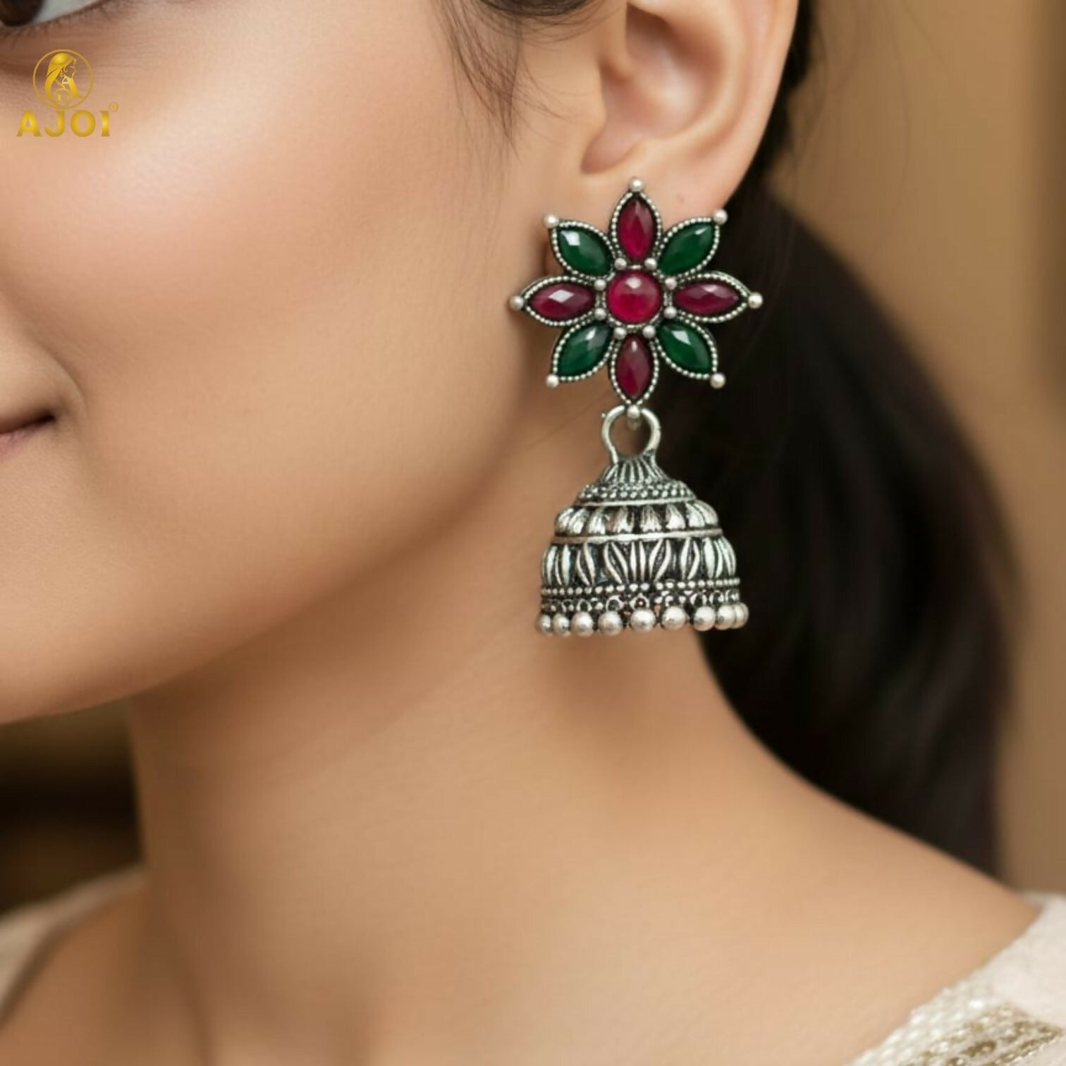 An ode to timeless Indian elegance, Shringara Ratnam earrings are crafted to celebrate beauty, artistry, and tradition. The exquisite floral stud is embellished with rich ruby and emerald-toned stones, forming a radiant bloom that reflects royal opulence. Below, a finely sculpted oxidized silver jhumka unfolds in intricate layers, echoing the grandeur of classical Indian ornamentation.