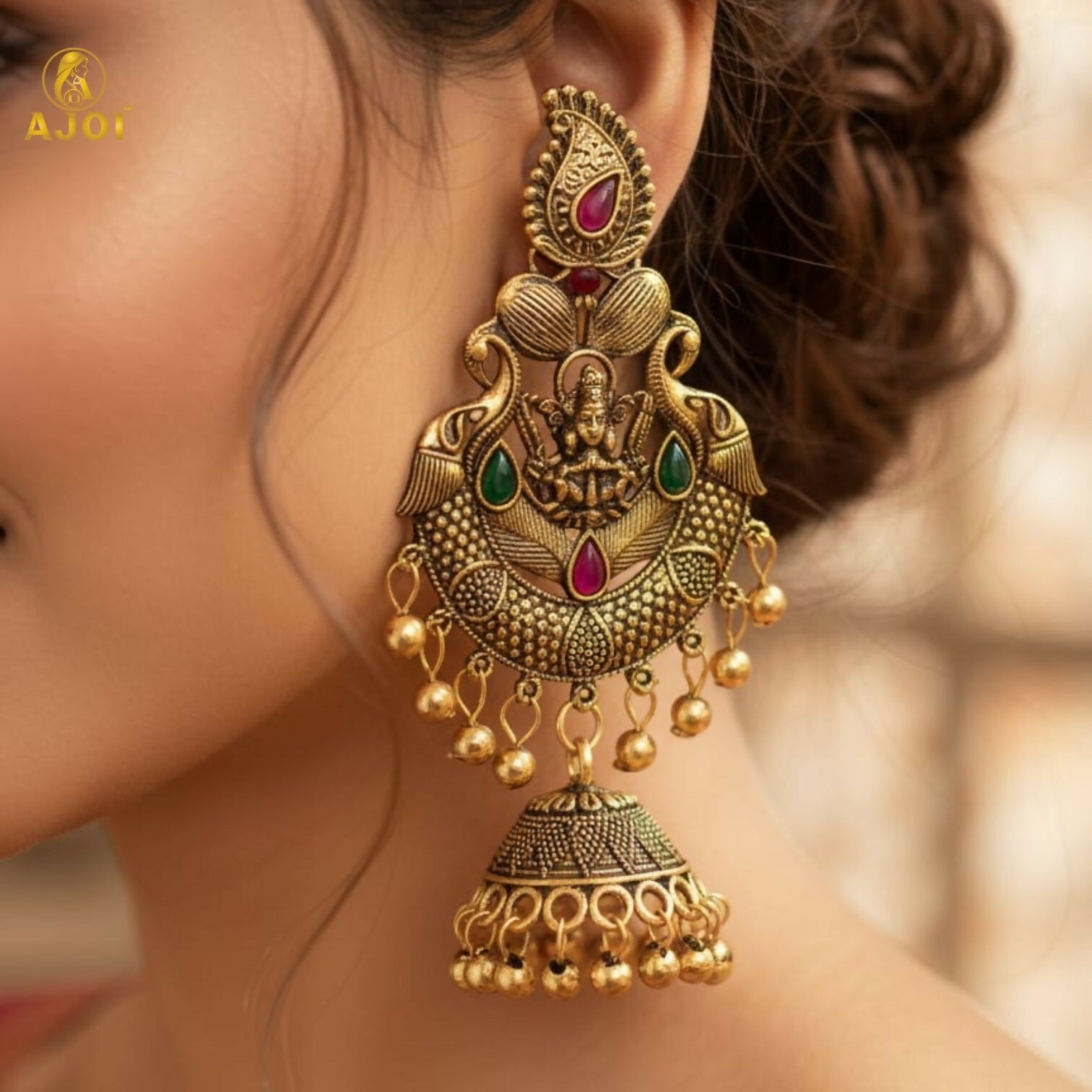 Premium Antique Gold Plated Temple Jhumka Earrings with Lakshmi Motif & Stone Work