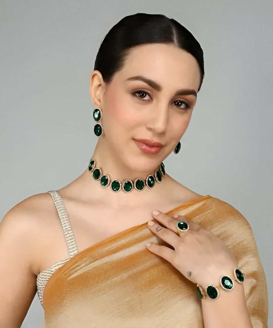 Each piece is designed to catch the light beautifully, showcasing deep green crystals surrounded by delicate halo accents for added brilliance. The necklace sits gracefully along the neckline, while the matching earrings, bracelet, and ring create a perfectly balanced ensemble ideal for formal events, weddings, parties, or special occasions.