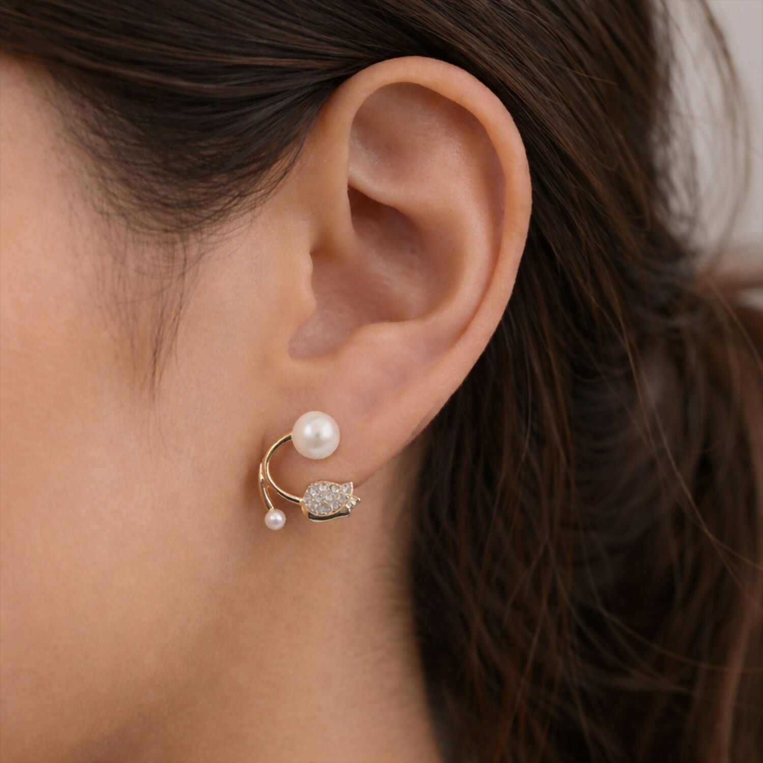 These stylish pearl and stone designer earrings feature a modern curved hoop-inspired design that adds a graceful touch to your look. The upper part is highlighted with a classic round pearl stud, while the lower curved section is beautifully detailed with a small pearl bead and a sparkling stone-studded charm. The elegant golden finish enhances the overall premium appearance, making the design look trendy yet sophisticated. Lightweight and comfortable to wear, these earrings are perfect for daily wear, office styling, parties, and festive occasions. A unique and fashionable accessory that complements both traditional and western outfits effortlessly.