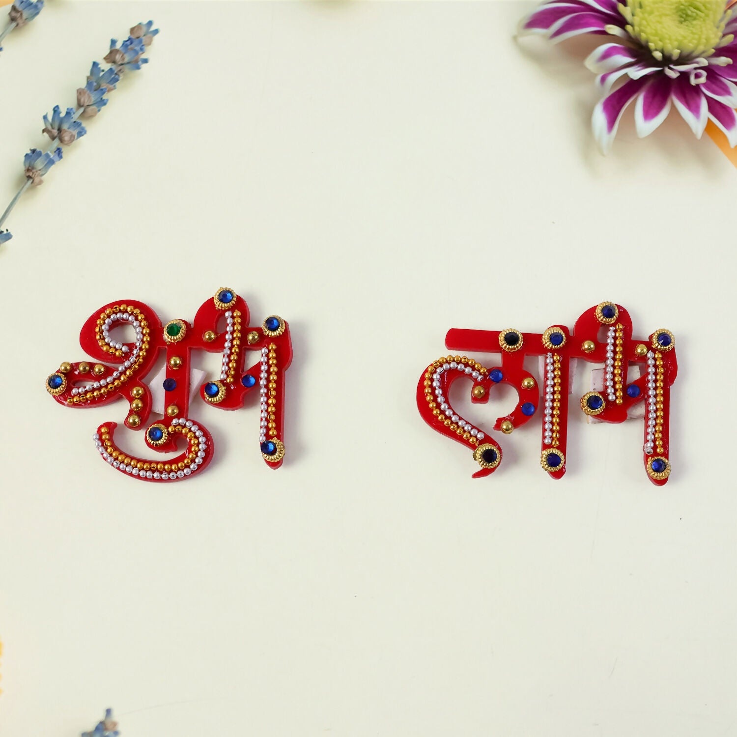 Traditional Shubh Labh door hanging made from premium acrylic in bright red with golden ball chain detailing and colorful stones. Simply stick or hang on your main door, shop entrance, or puja room to invite prosperity and good fortune during Diwali, Navratri, and other auspicious occasions.