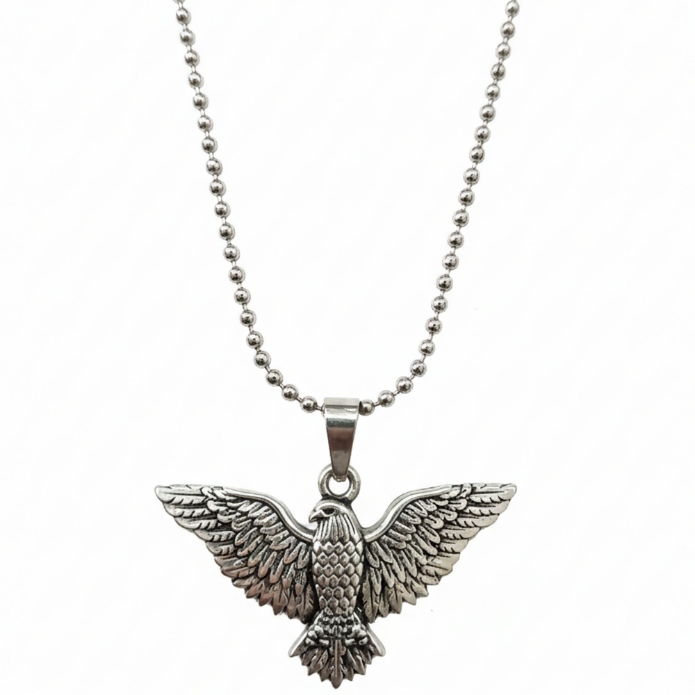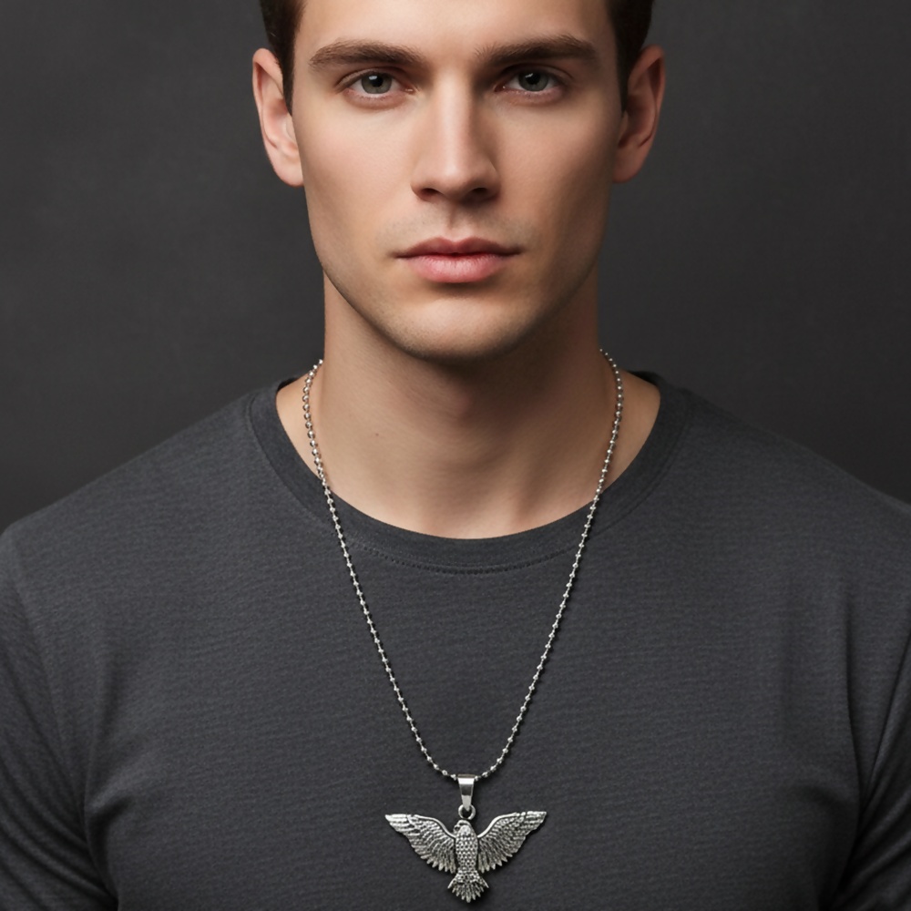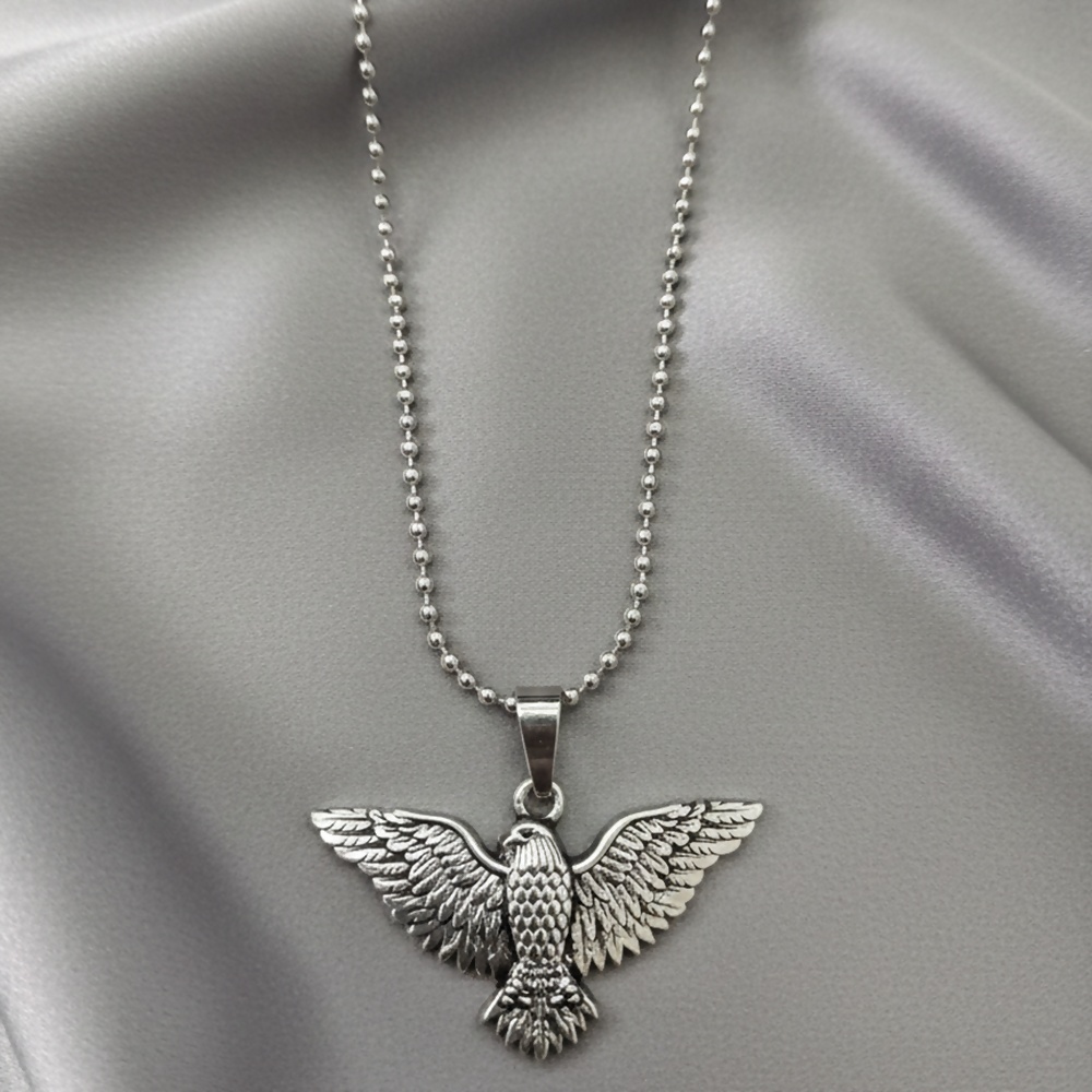 This stylish flying eagle pendant necklace showcases a powerful and detailed design symbolizing strength, freedom, and confidence. Crafted in a polished silver finish, the finely detailed eagle with spread wings adds a bold statement to your look.