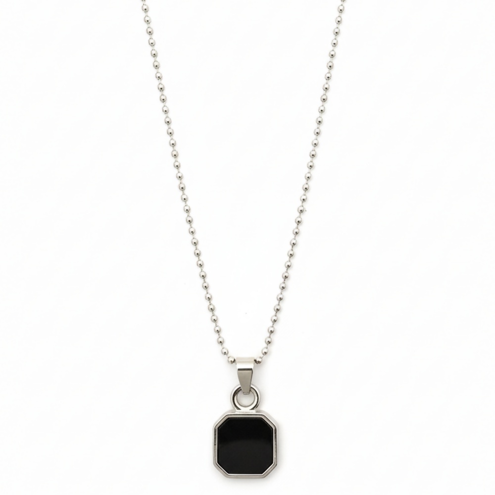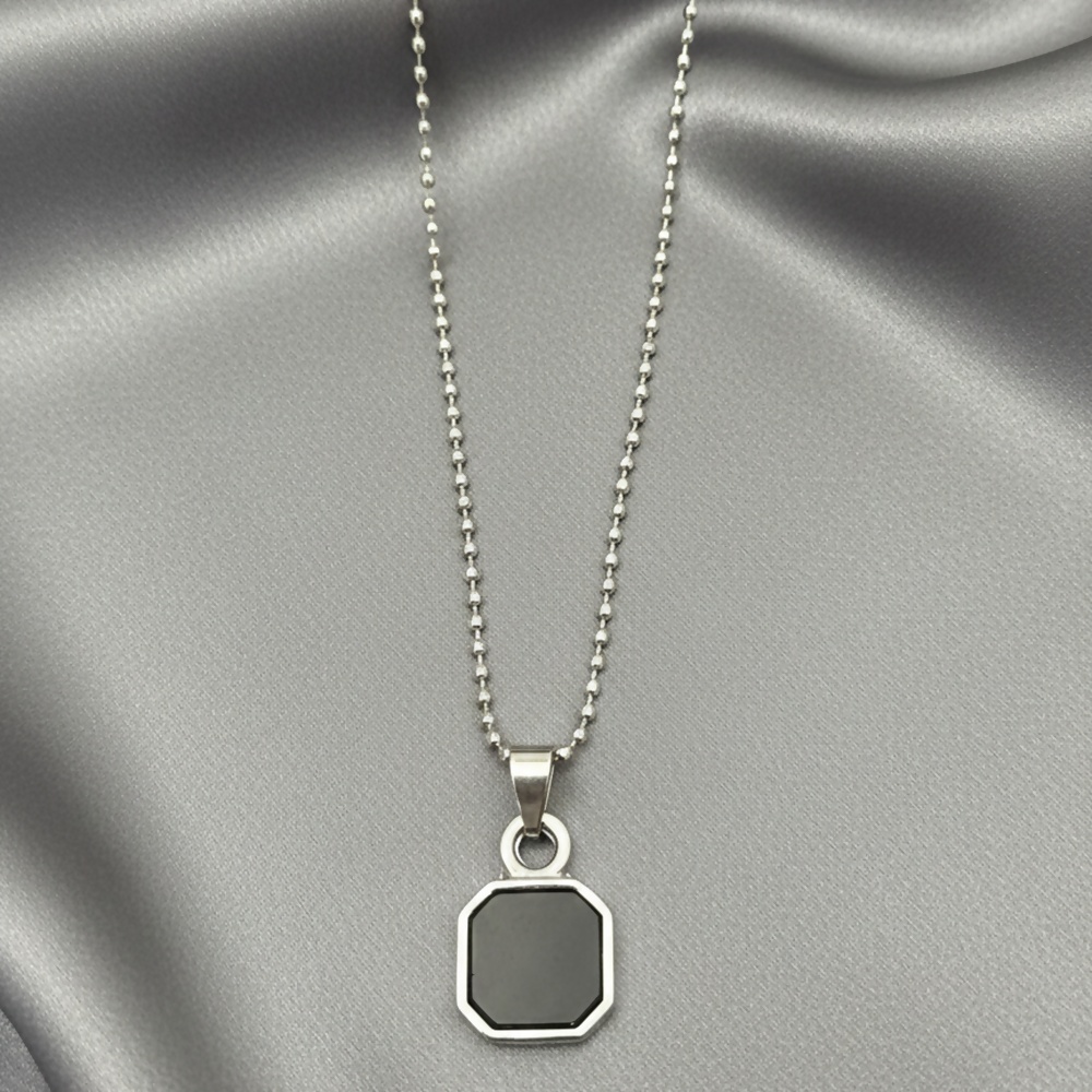 This elegant octagon-shaped black pendant necklace is designed for men who appreciate clean geometry and modern styling. Featuring a smooth black inlay bordered by a polished silver-toned frame, the pendant delivers a bold yet refined look.