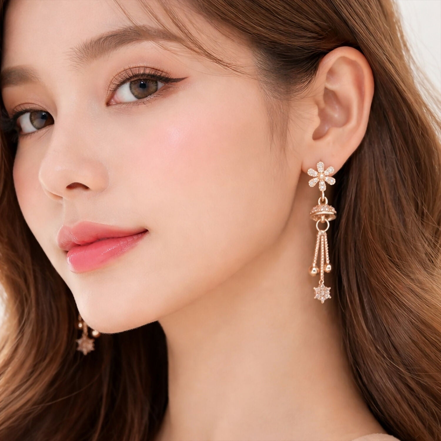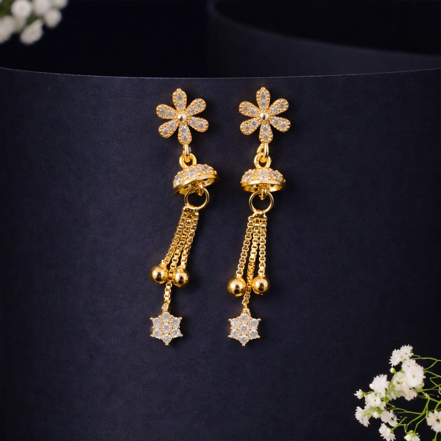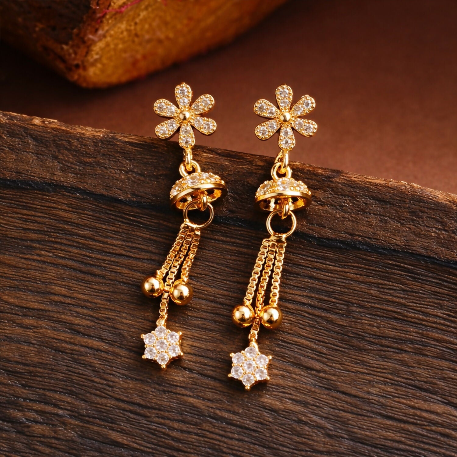 Graceful Shine with a Modern Edge Illuminate your look with these charming rose-gold-toned drop earrings. The design features a unique, sharp geometric stud that transitions into a delicate, dangling floral star, creating a beautiful balance of strength and softness.