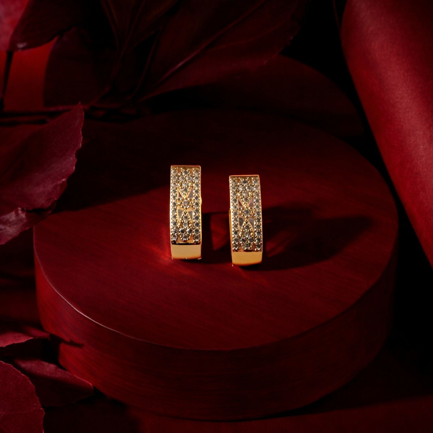 These gold plated cubic zirconia hoop earrings are designed to make a statement at parties and special occasions. Featuring shimmering CZ stones and a premium gold finish, they add a luxurious touch to both traditional and western outfits. Lightweight yet durable, these earrings are perfect for weddings, festivals, and gifting.