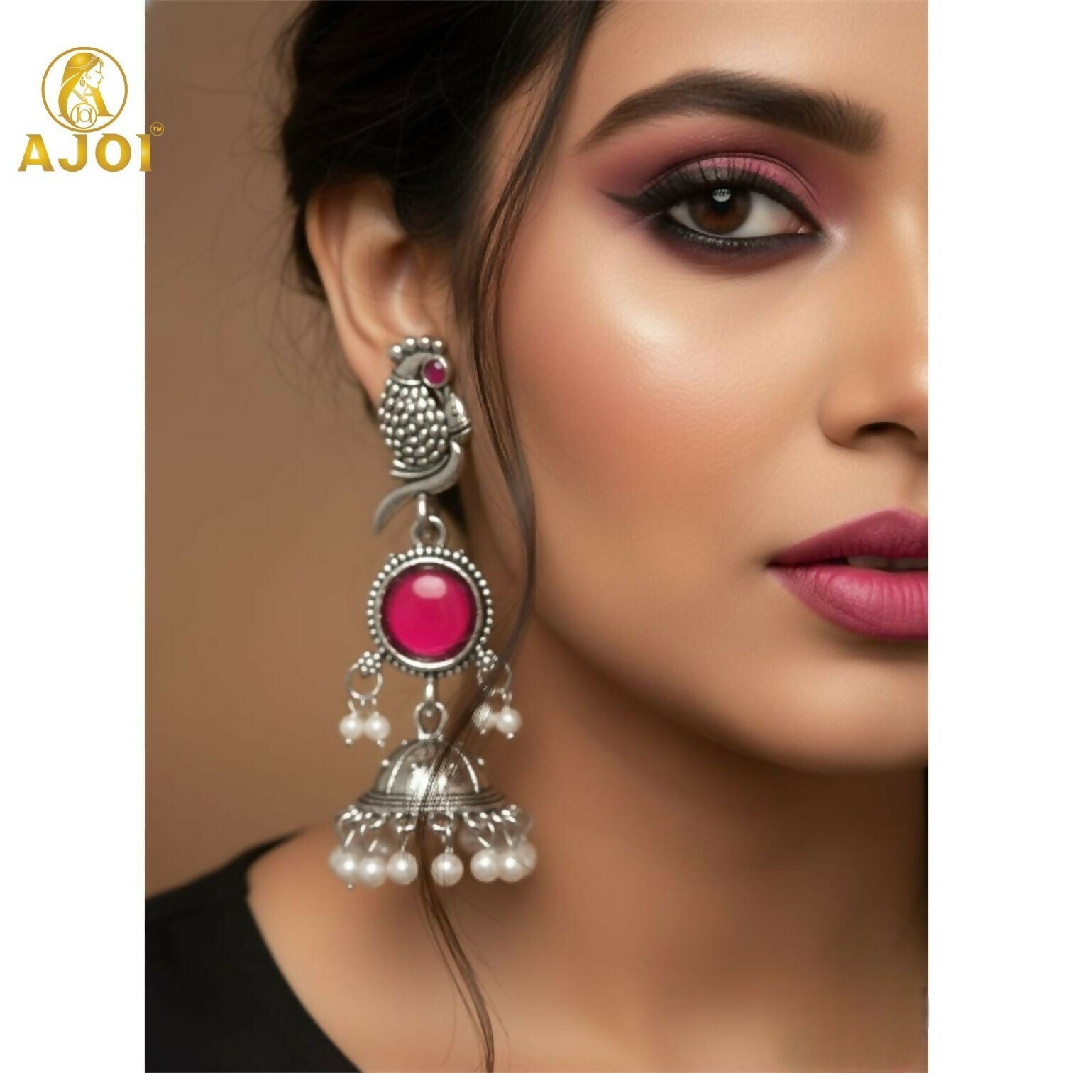 Antique Silver Peacock Jhumka Earrings with Pink Stone & Pearl Drops – Traditional Ethnic Dangle Earrings