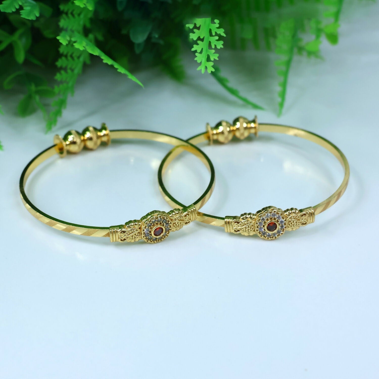 These beautifully crafted bangles feature an elegant floral centerpiece accented with a sparkling stone, paired with delicate bead details for added charm. The slim, textured band enhances the overall look, making them perfect for festive wear, family functions, or everyday elegance. Lightweight and stylish, they blend traditional design with modern simplicity.