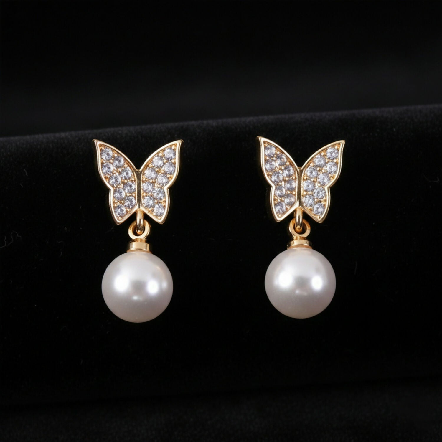 Ye elegant butterfly design earrings ek classy aur feminine look dete hain. Upar butterfly shape me shining CZ stones lage hue hain jo light me soft sparkle dete hain, aur niche smooth pearl drop design hai jo overall look ko aur graceful banata hai. Daily wear se leke party, festive aur gifting purpose ke liye ye earrings perfect choice hain. Lightweight design hone ki wajah se kaan par comfortable lagte hain aur long time tak pehne ja sakte hain. Simple outfits ke saath bhi ye earrings easily standout karte hain aur ethnic ya western dono styles ke saath suit karte hain.