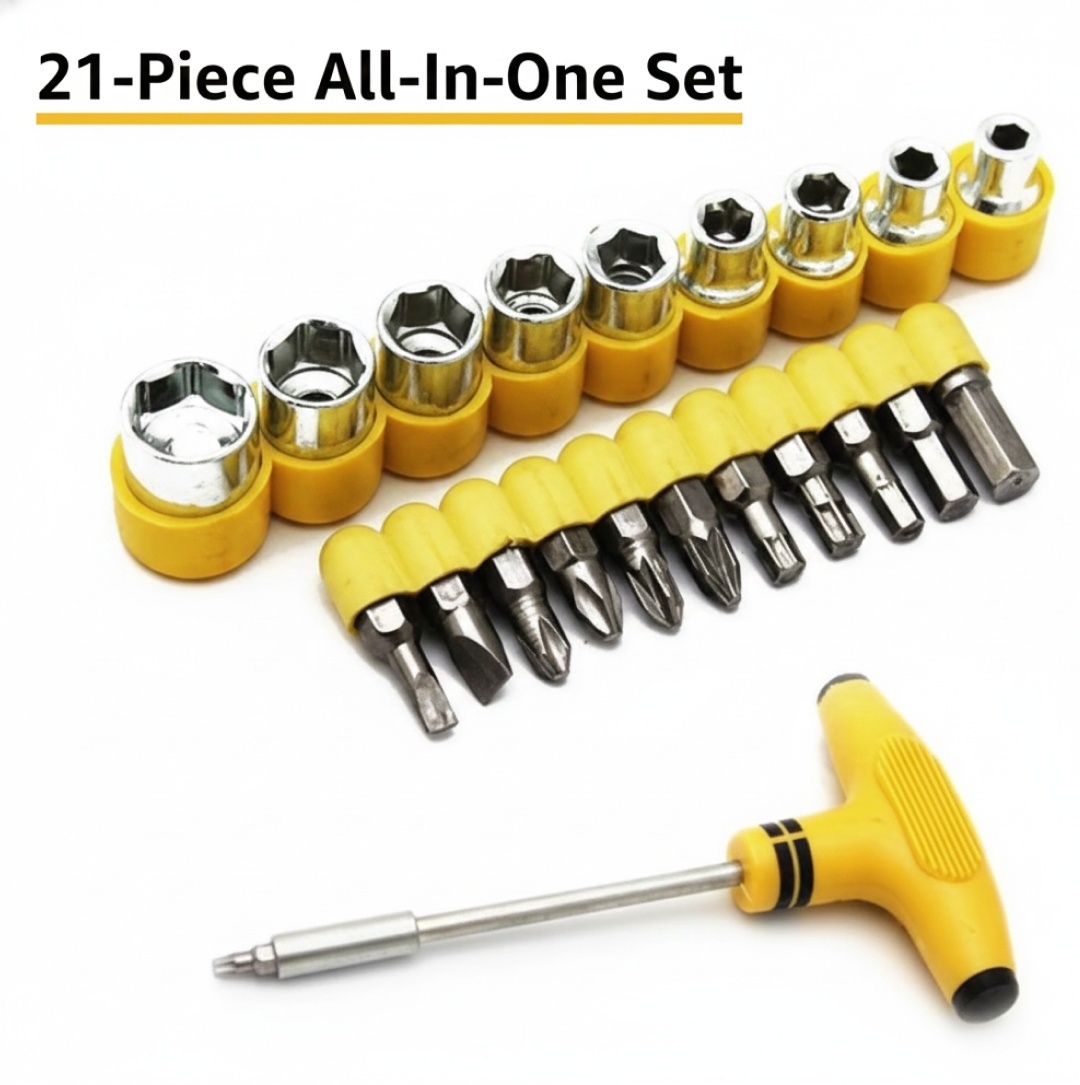 - One T Screwdriver Handle 9 Sockets (Sizes: 4 mm - 12 mm) 11 Screwdriver Bits (Sizes: 3 mm 8 mm) which comprise : 3 flat(-)type screwdriver bits 3 Philips screwdriver bits(+) type 5 Torx screwdriver bits (Flower type) Professional Tool kit : Ideal for professional, home, Car & Office use Compact tool that can use for Screws & nuts both Also