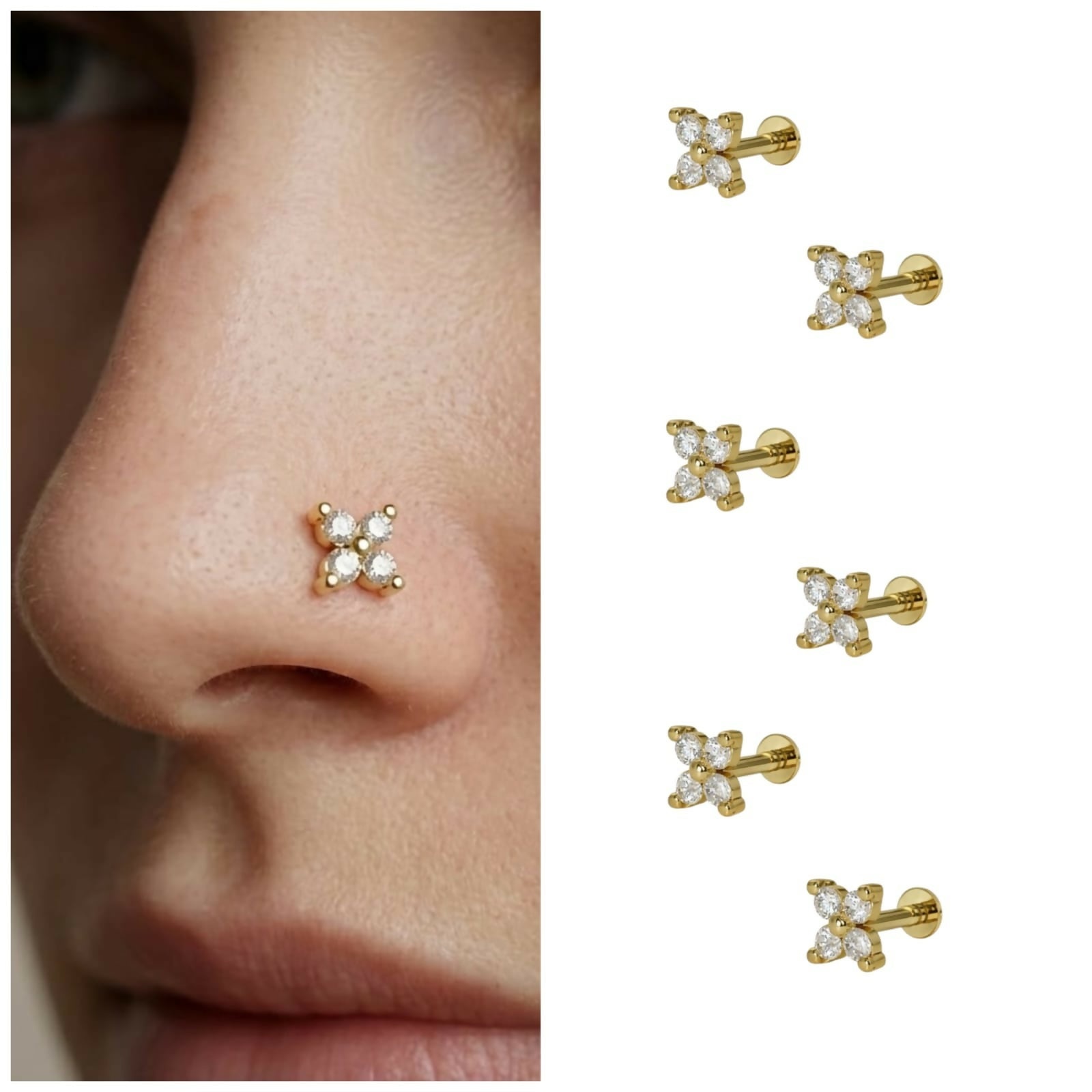 Gold plated Clover Flat Back AD Nosepin Stud for women and girls Combo Pack of 6