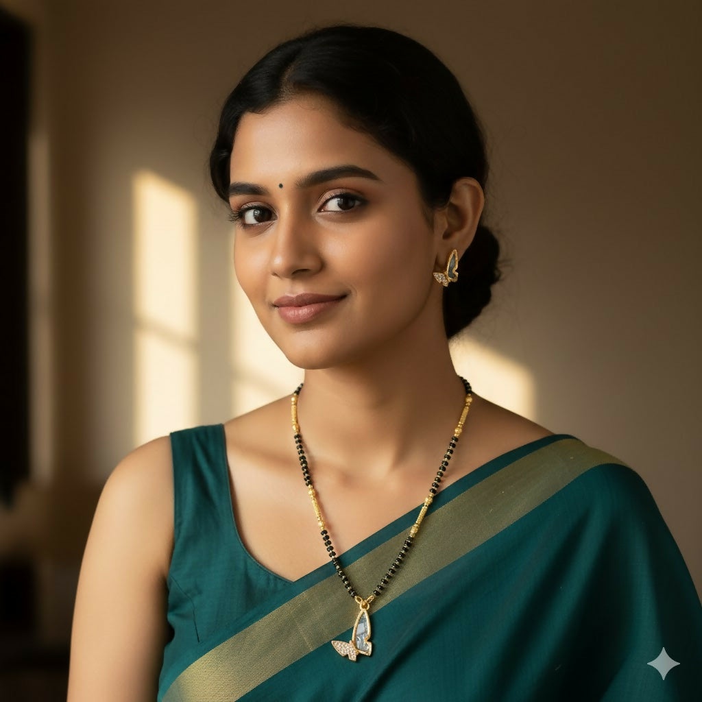 Elevate your daily elegance with a touch of whimsy and tradition. This exquisite Mangalsutra set reimagines classic heritage for the modern woman. Featuring a delicate butterfly motif, the pendant and matching earrings are crafted with a sophisticated dual-tone finish. The wings are intricately detailed with shimmering pavé-set stones and a unique textured inlay, offering a graceful sparkle that transitions perfectly from office wear to evening outings.