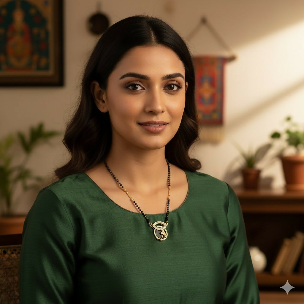 Elevate your everyday elegance with this stunning contemporary Mangalsutra. Blending traditional significance with modern aesthetics, this piece is designed for the woman who appreciates timeless style. Featuring a delicate chain of jet-black beads interspersed with shimmering gold-toned accents, it leads to a uniquely crafted circular pendant.
