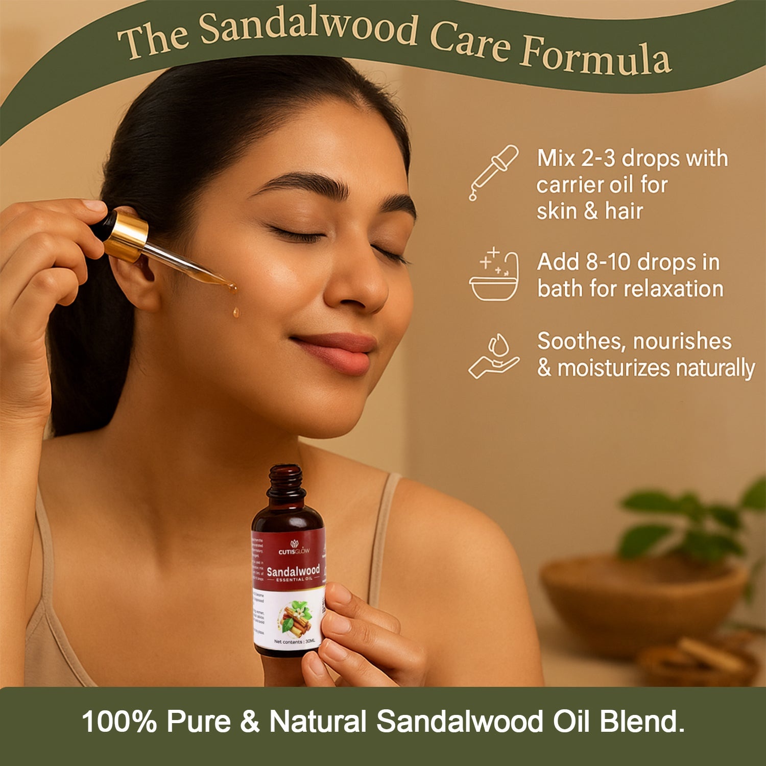 Experience the soothing essence of nature with CutisGlow Sandalwood Essential Oil, carefully crafted to deliver purity and natural wellness in every drop. Known for its calming aroma and therapeutic benefits, sandalwood oil is a timeless choice for skincare, haircare, and aromatherapy.
