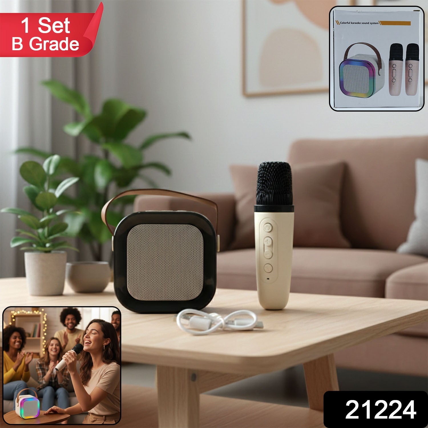 B Grade Portable Karaoke Speaker with Wireless Microphone and Charging Cable – Home Party Singing System (1 Set)
