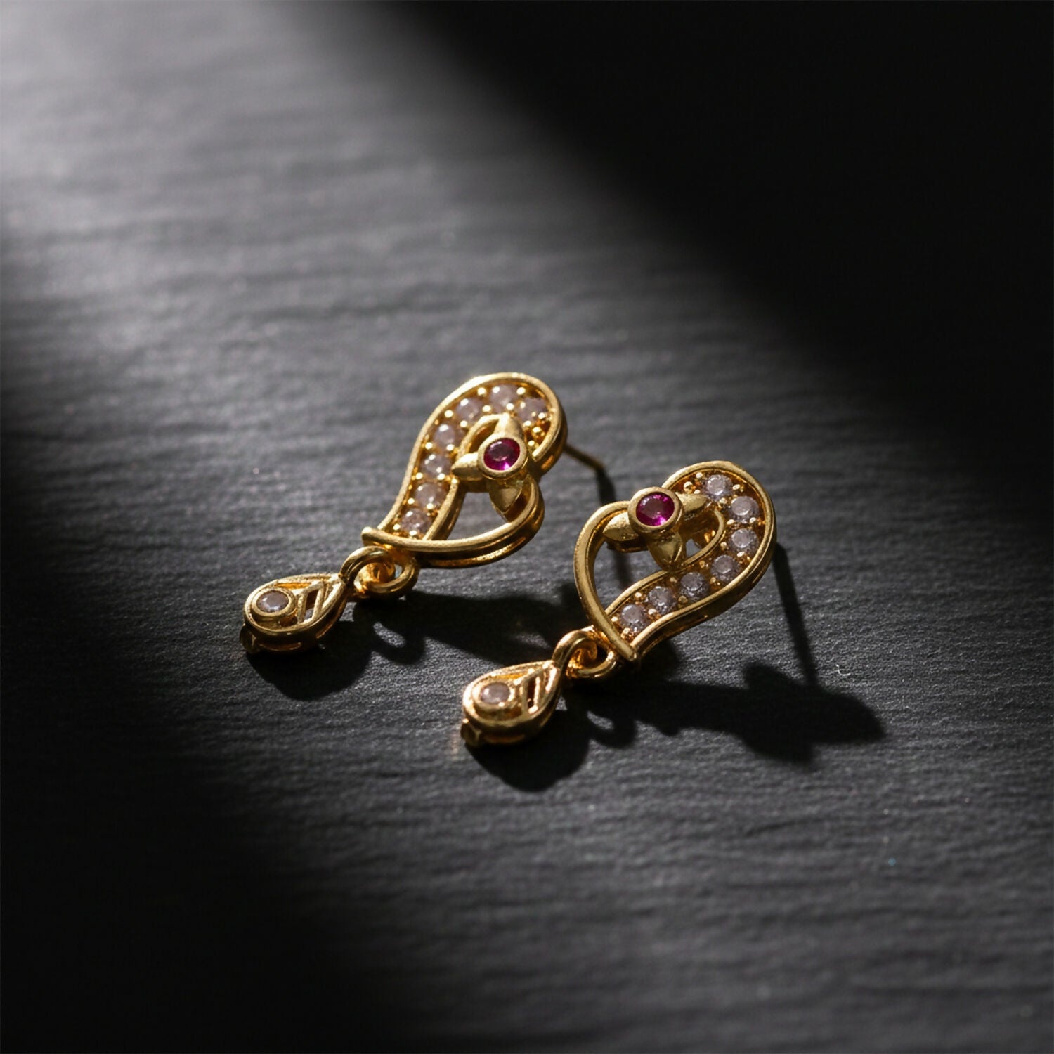 These elegant gold drop earrings feature a graceful paisley-inspired design, adorned with sparkling white stones and a rich ruby-colored accent at the center. The curved silhouette is highlighted by delicate stone detailing, while a small dangling drop adds movement and charm. Crafted to reflect timeless traditional artistry, these earrings blend classic sophistication with a modern finish—perfect for festive occasions, weddings, or ethnic wear styling.