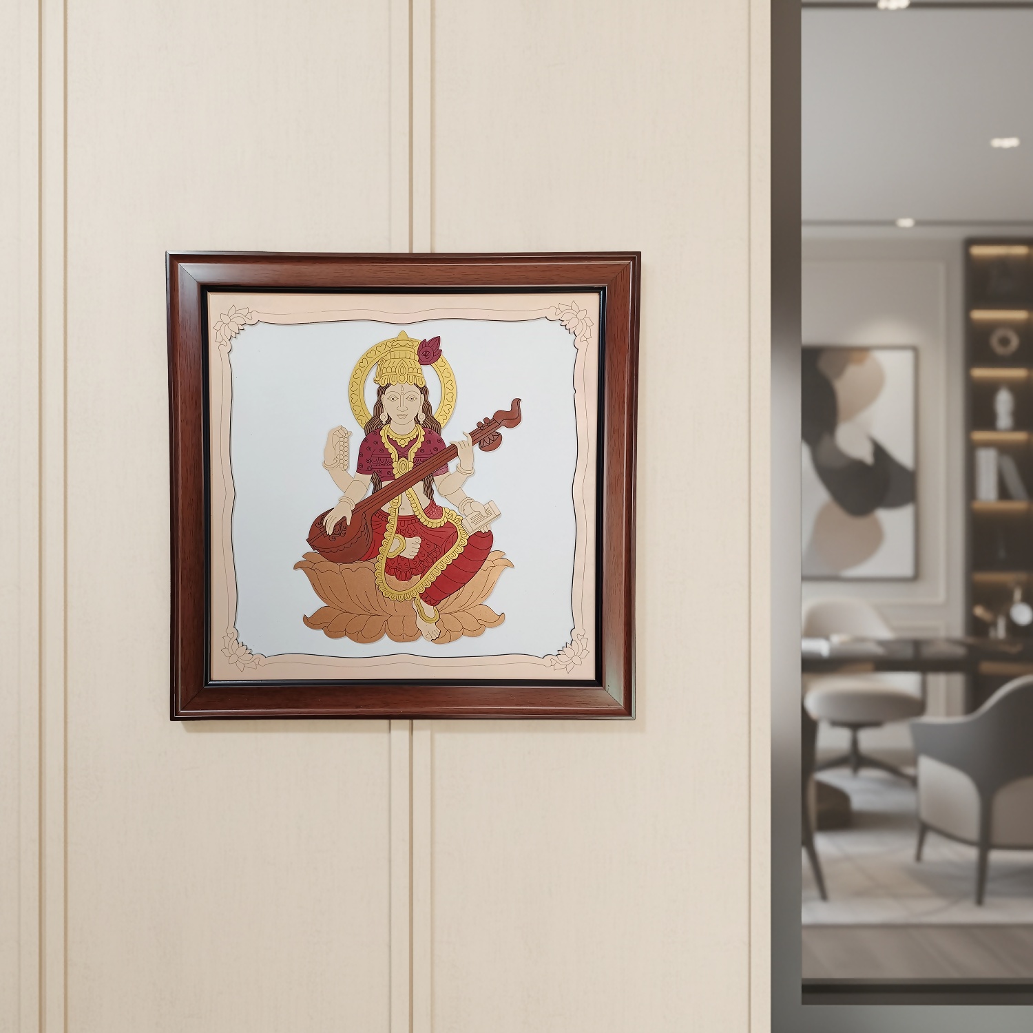 Goddess Saraswati Wooden Framed Wall Art | Handcrafted Hindu Religious Painting for Home, Office & Pooja Room | Premium Spiritual Decor