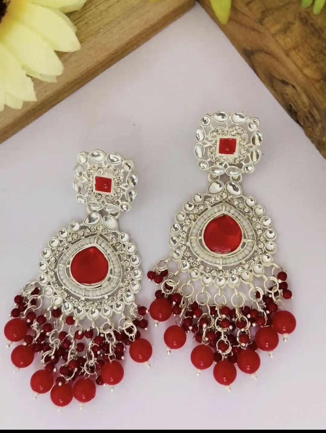 This pair of Silver-Plated Kundan Dangler Earrings features a vibrant red-and-white color palette. The design combines the classic brilliance of Kundan stones with the playful movement of beaded tassels, resulting in a statement piece that is both regal and festive.